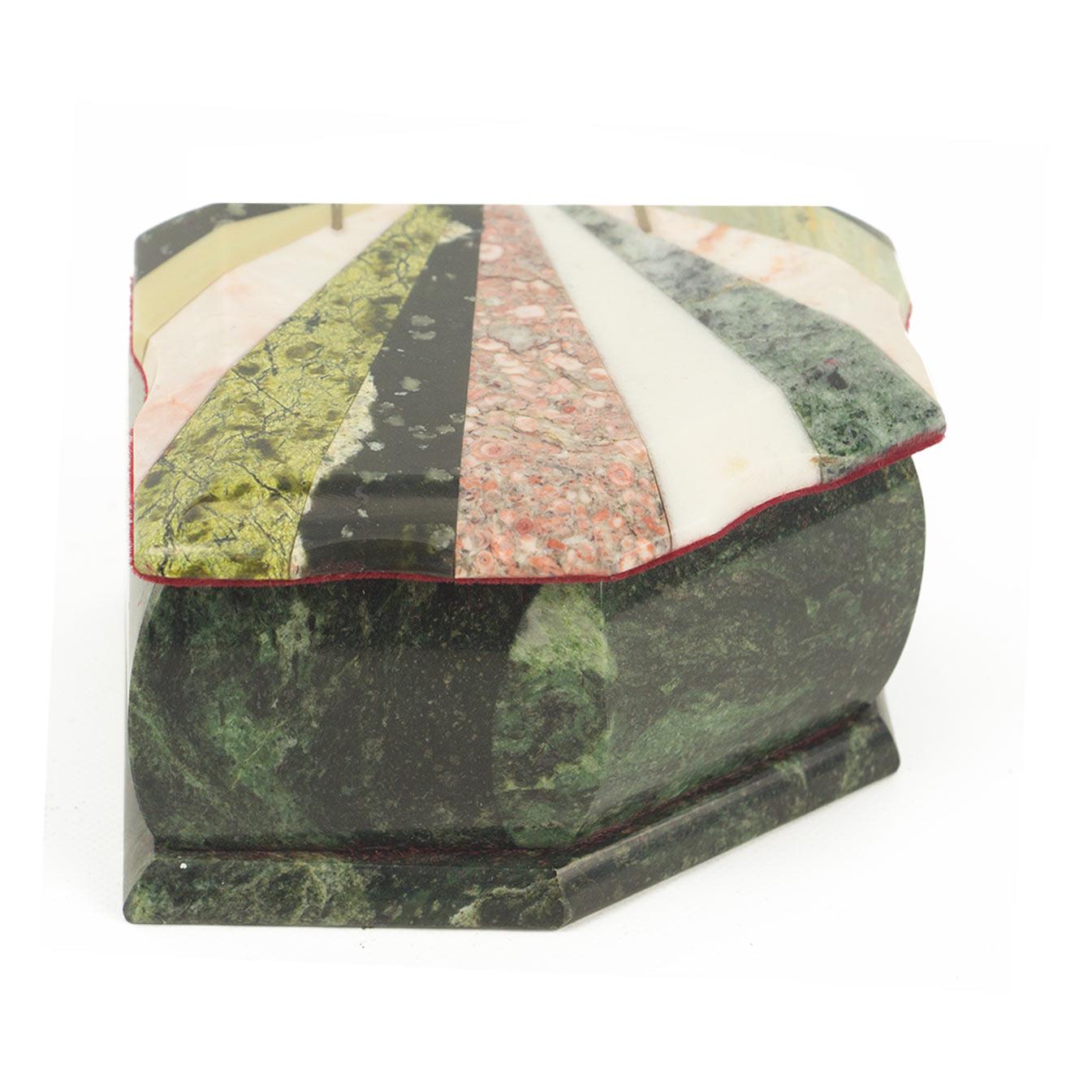 Шкатулка с мозаикой креноид змеевик офиокальцит мрамор 110х90х65 мм 760 гр. Вес 760 г Размер 11х9х6,5 см Материал креноид, змеевик офиокальцит, мрамор и др. уральские камни  развернуть описание ▼