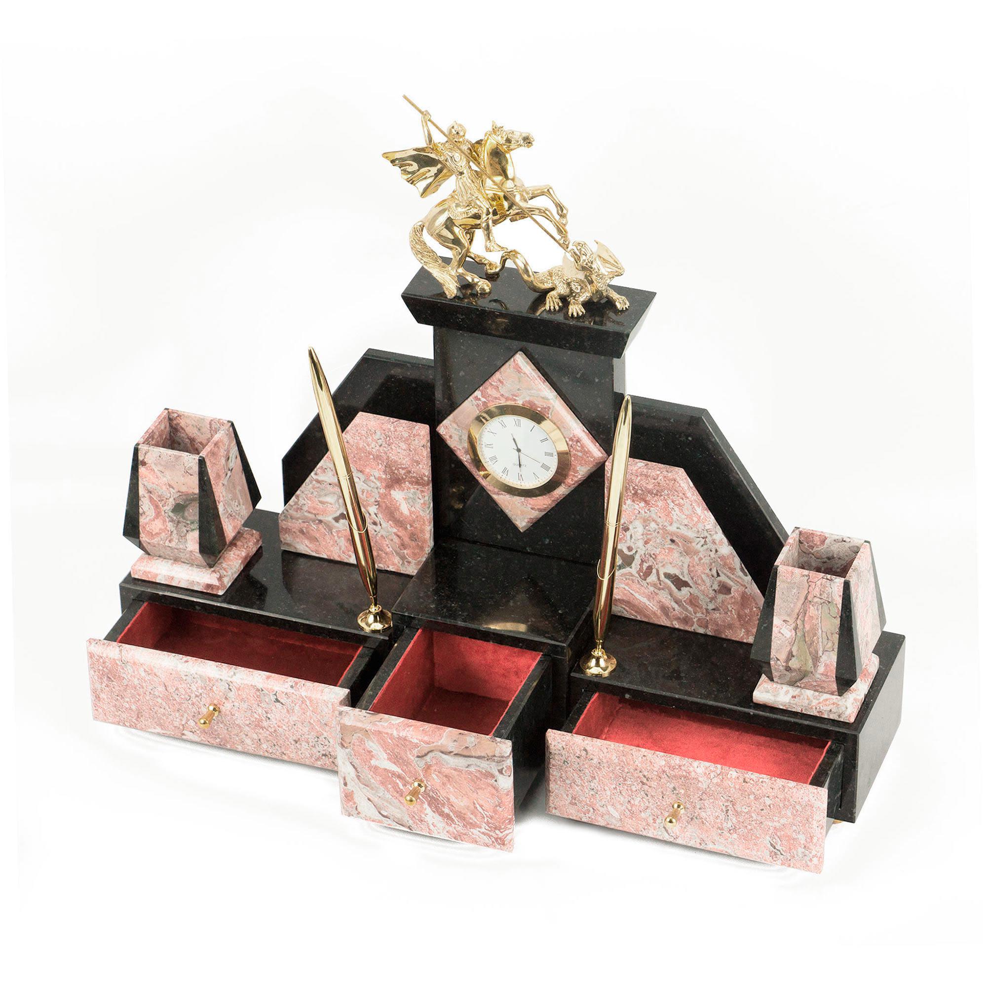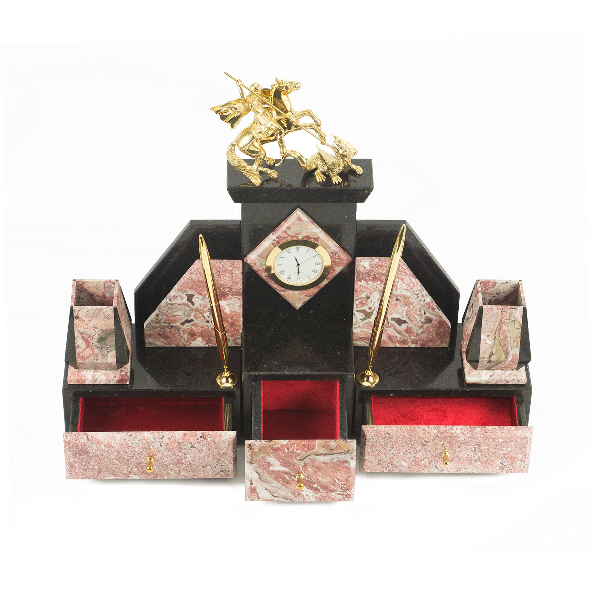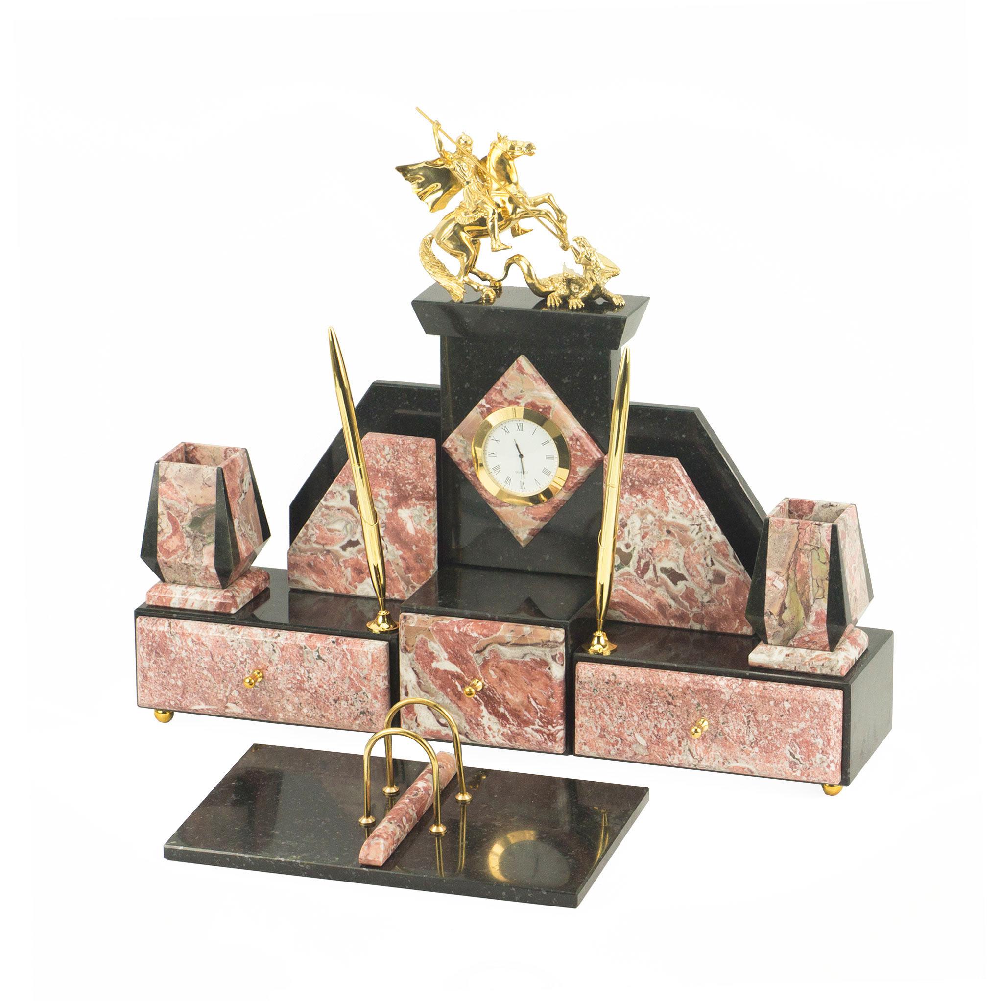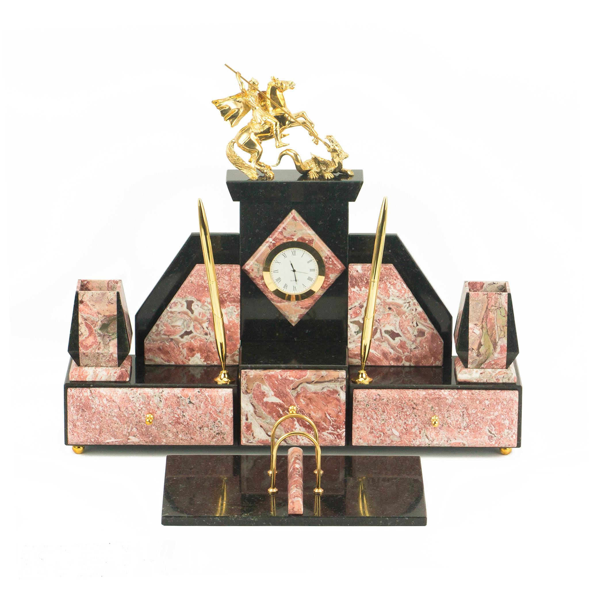 настольный набор "георгий победоносец" креноид бронза 470х270х380 мм 105. Вес 10500 г Размер часы 47х27х38 см, календарница 23,5х16х2,5 см Материал креноид, змеевик, бронза  развернуть описание ▼