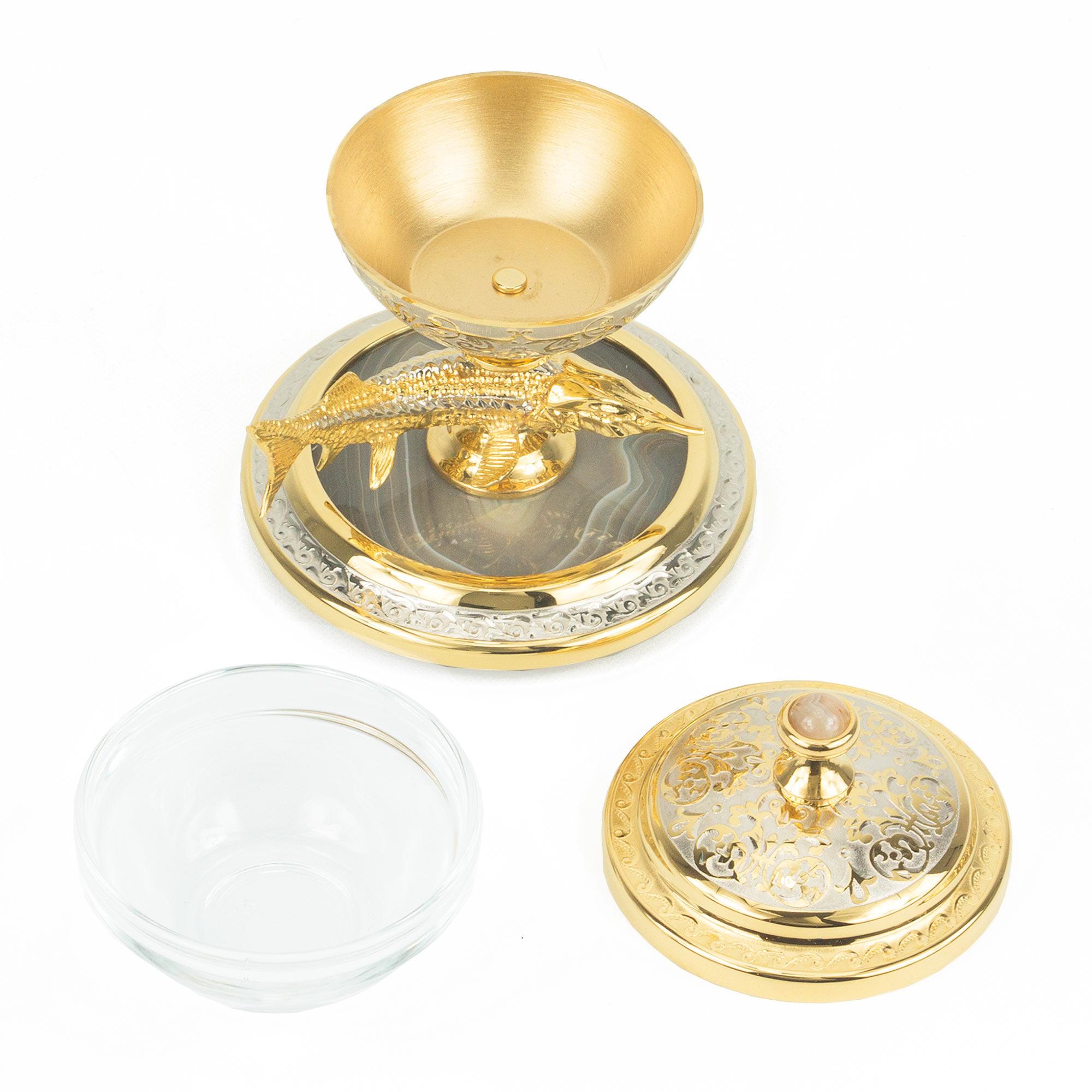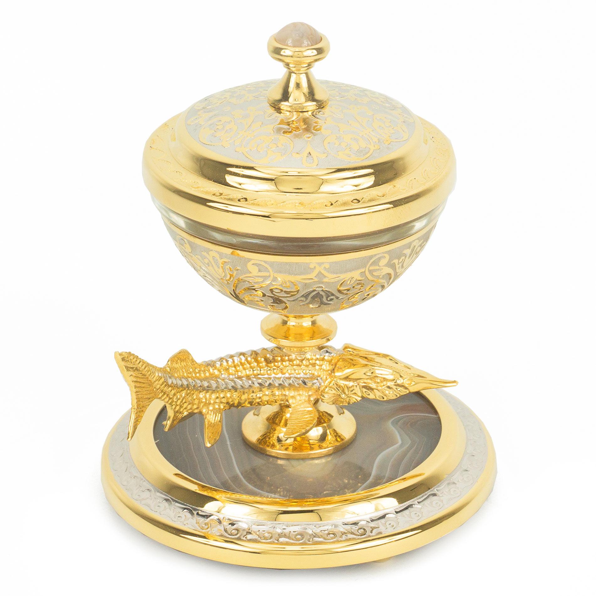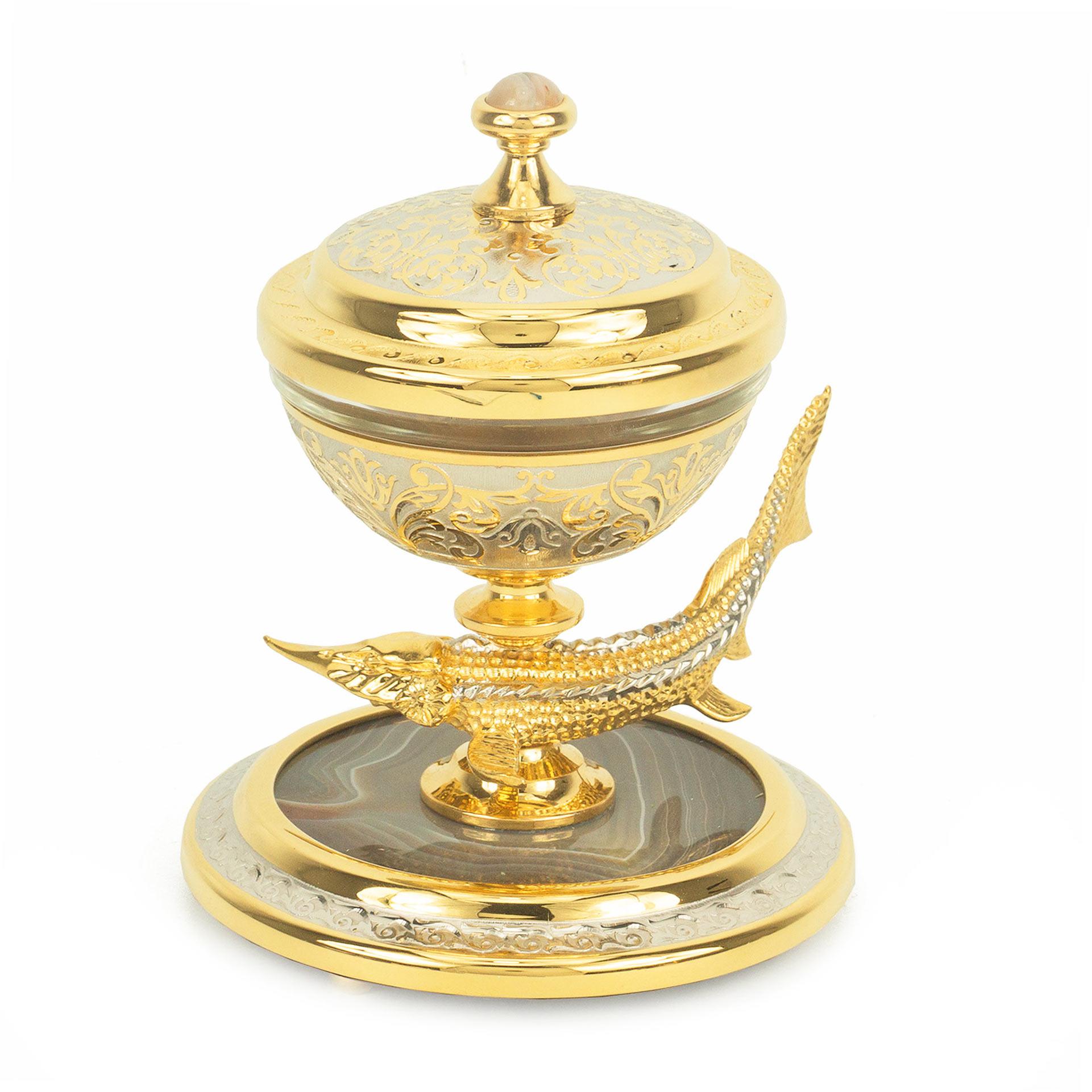 Икорница "стерлядка" агат позолота 100х100х130 мм 2100 гр.. Вес 2100 г Размер 10х10х13 см Материал агат, бронза, никель, покрытие золотом (999,9)  развернуть описание ▼