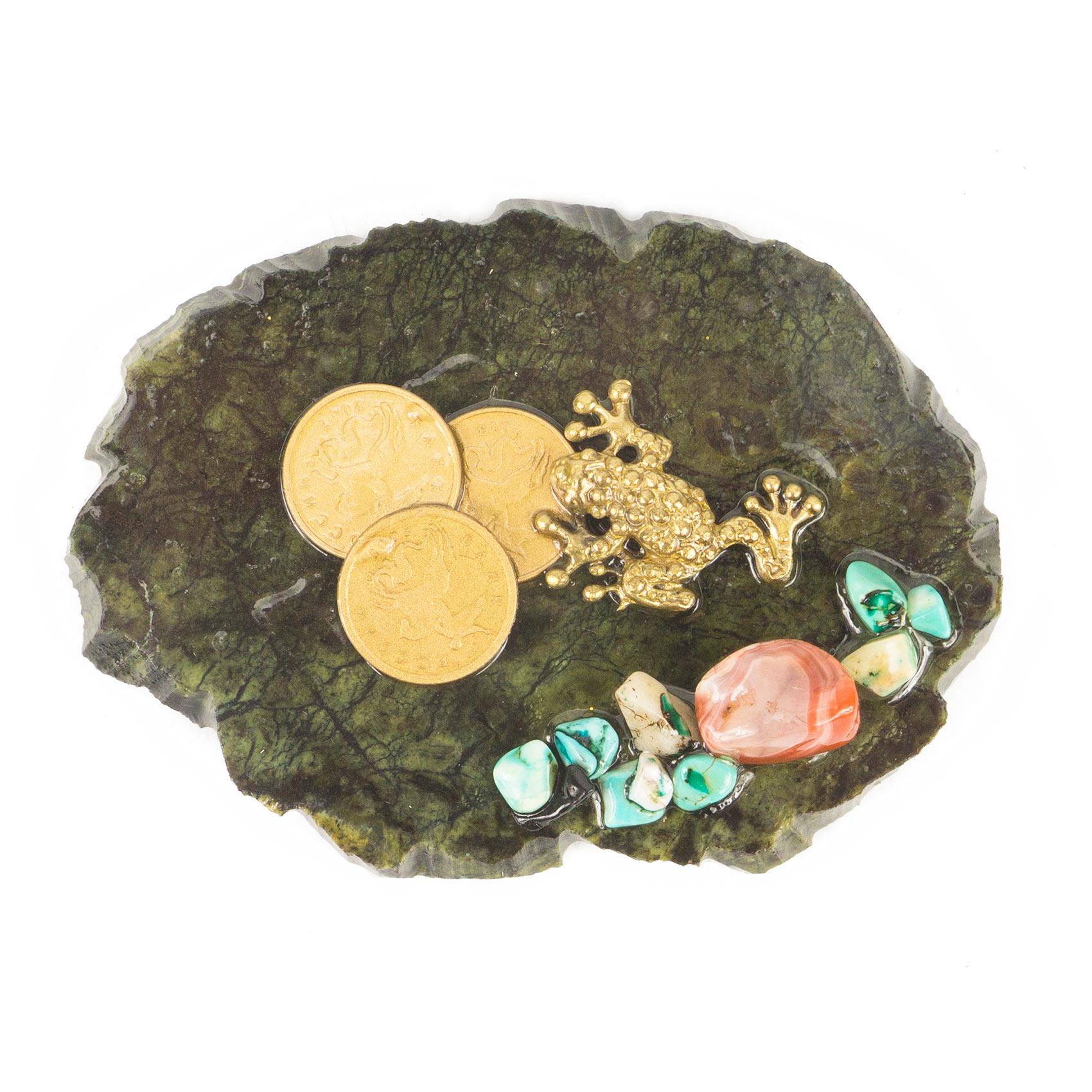 Магнит "лягушка с монетами" змеевик 65х90 мм 90 гр.