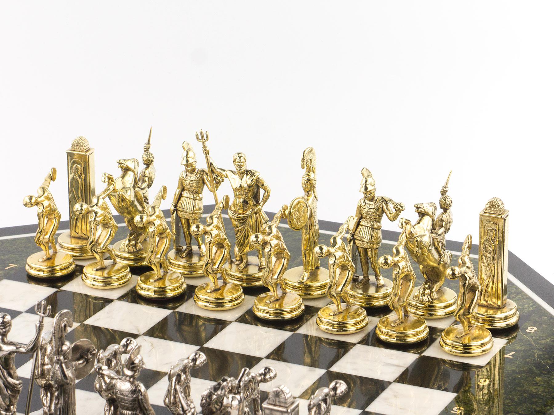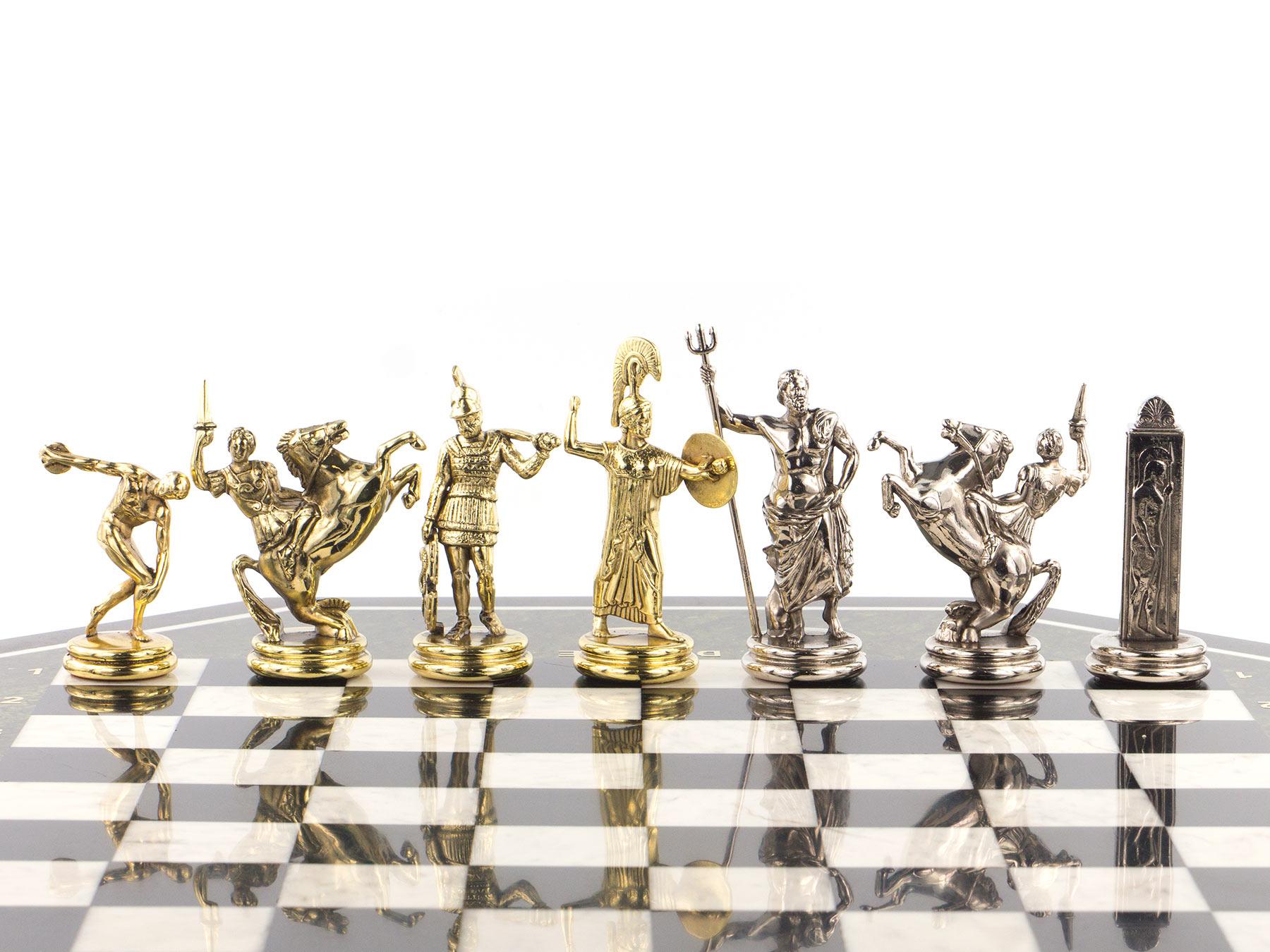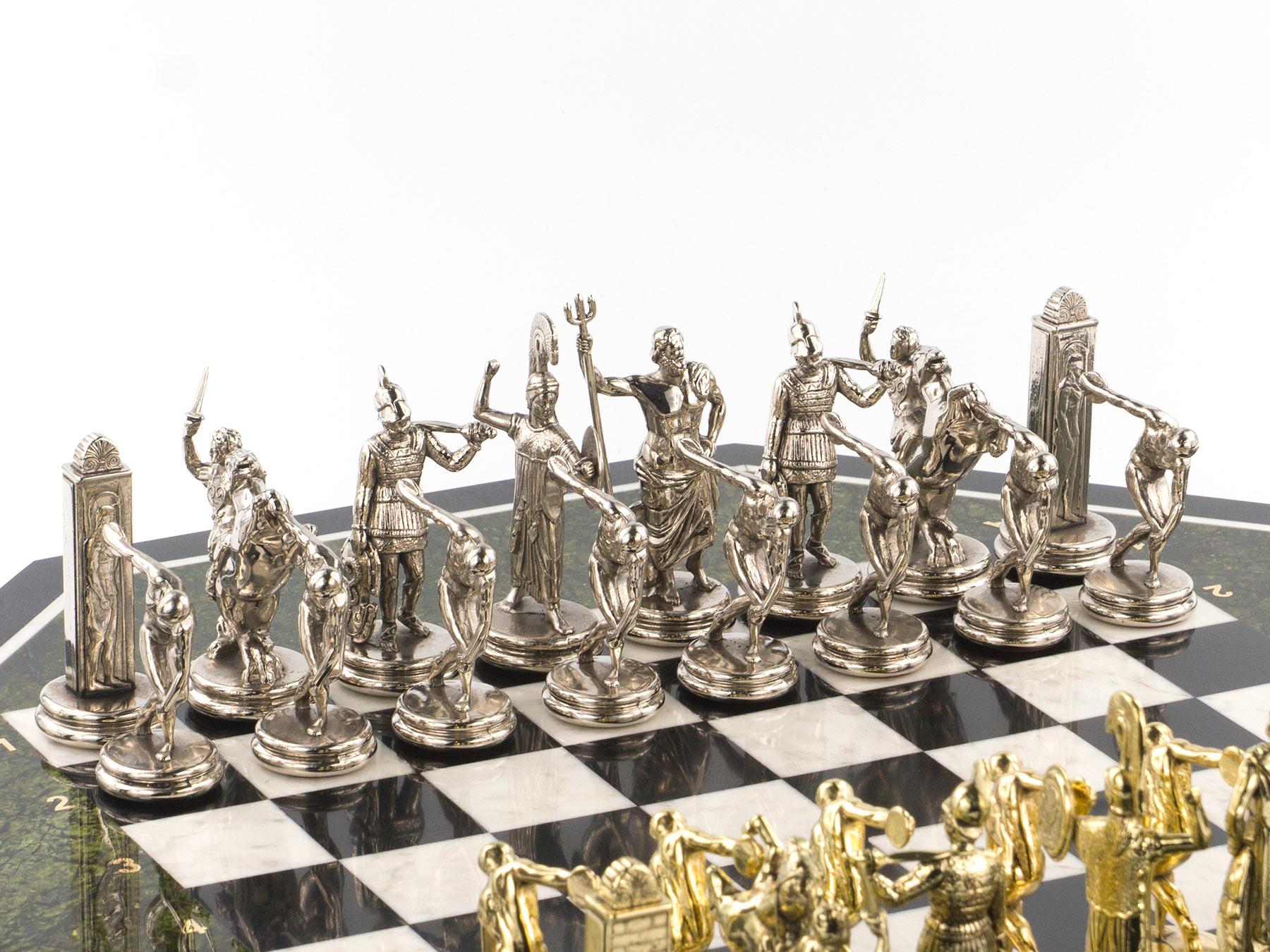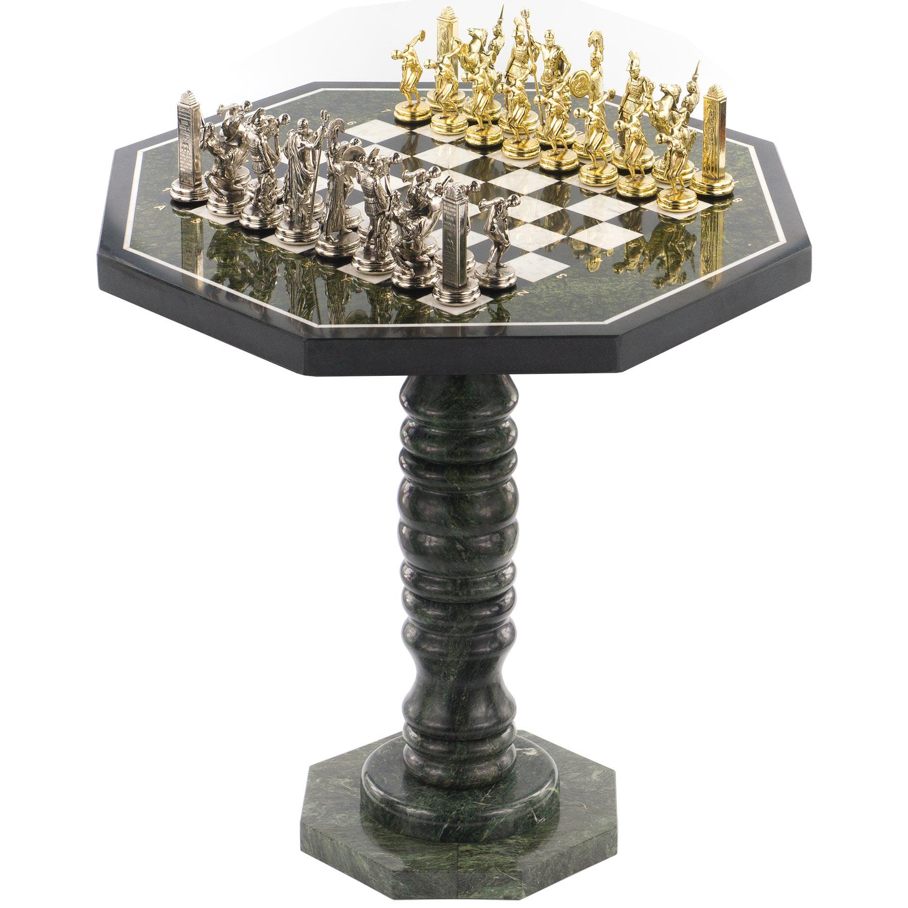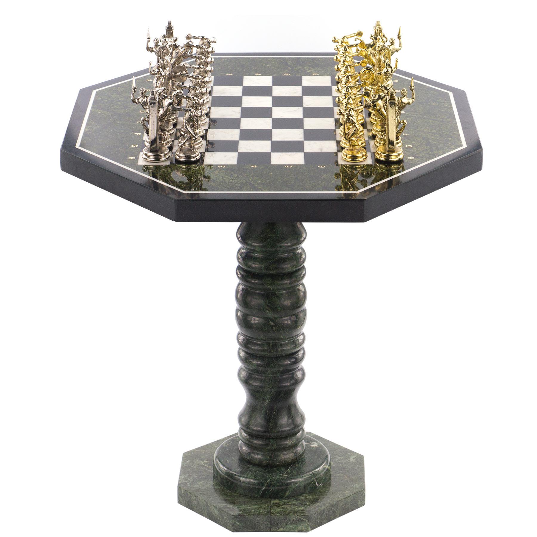 Шахматный стол фигуры "метатели дисков" мрамор змеевик металл 60. Вес 45000 г Размер стол 60х60х62 см, клетка 4,5х4,5 см, высота фигур: пешка 7,4 см, король 11 см Материал стол из мрамора и змеевика, фигуры из сплава замак  развернуть описание ▼