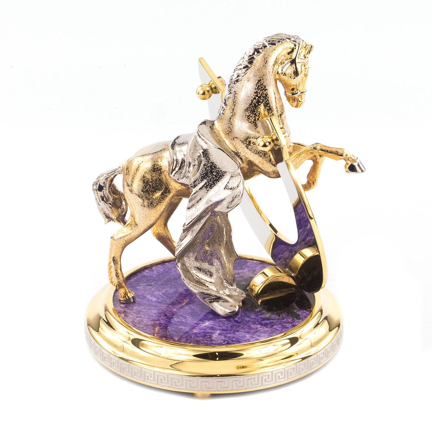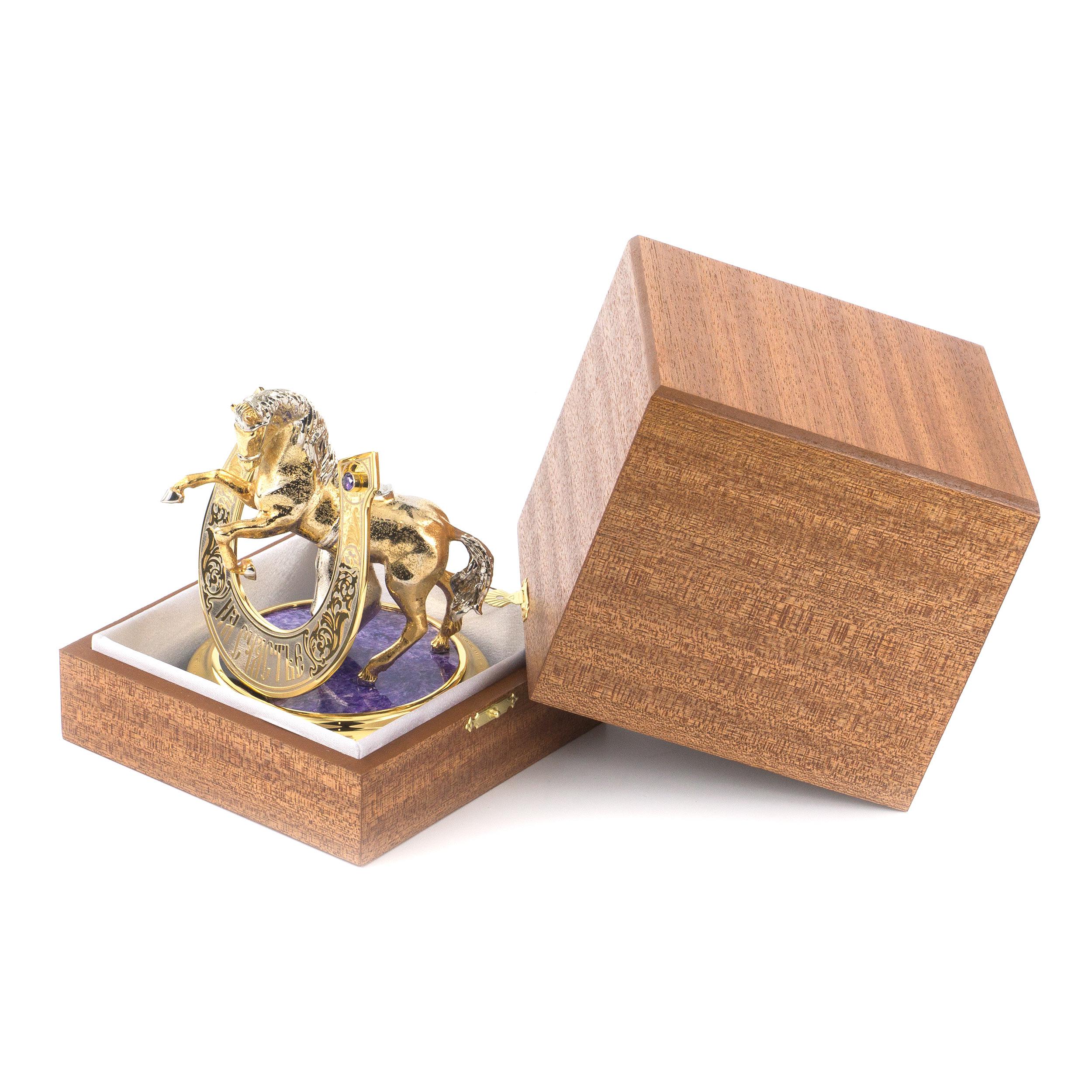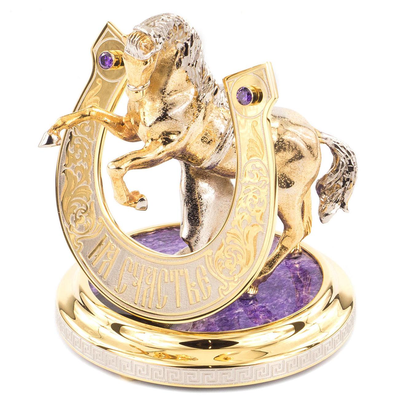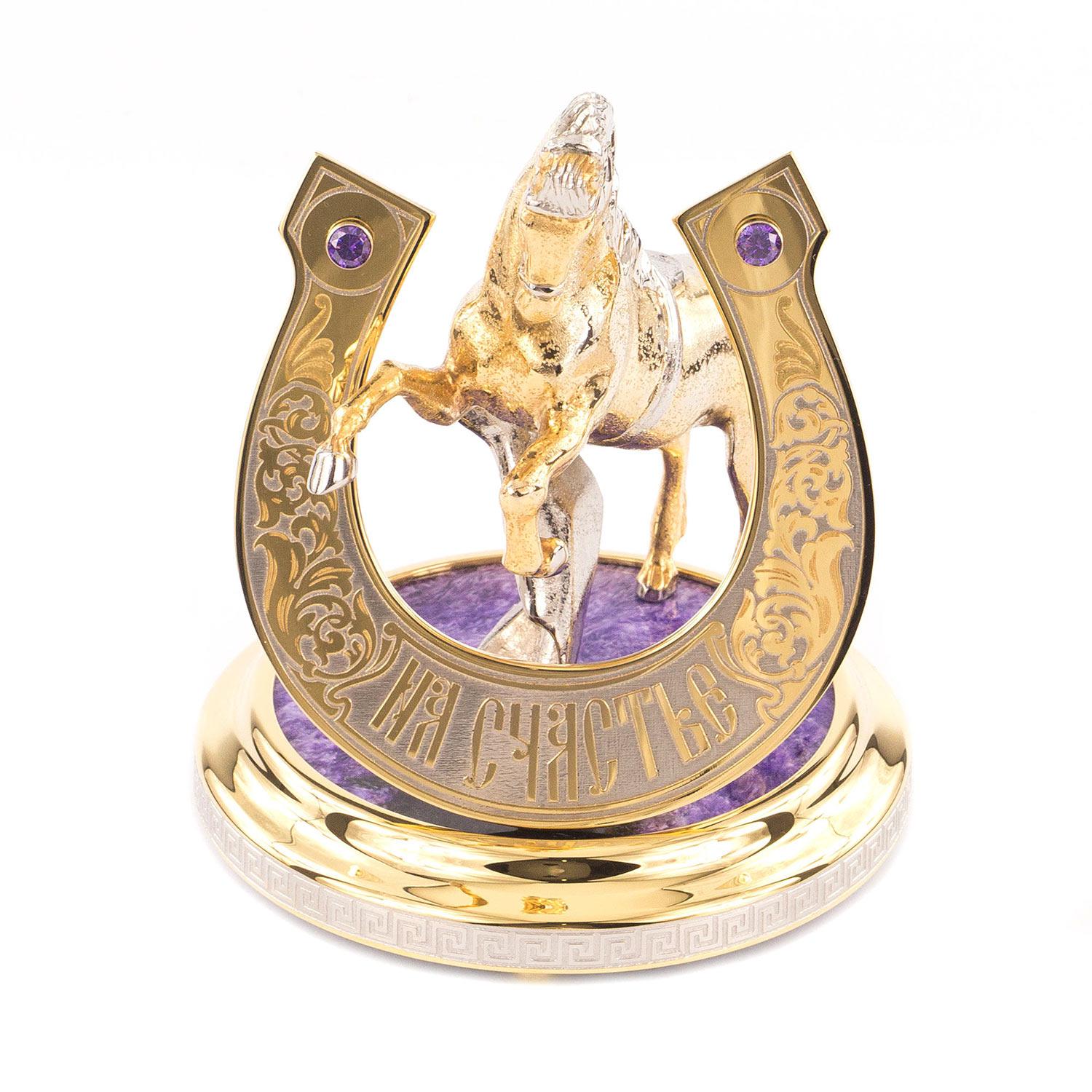 Сувенир "подкова на счастье" чароит 125х125х150 2050 гр.. Вес 2050 г Размер 12,5х12,5х15 см Материал чаорит, бронза, никель, покрытие золотом (999,9).  развернуть описание ▼