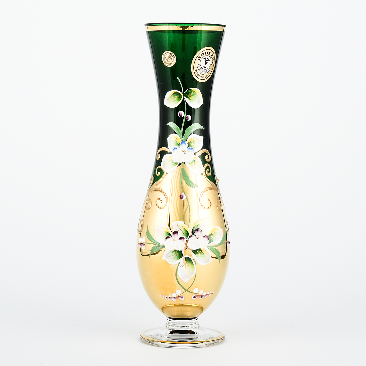 Ваза для цветов bohemia лепка зелёная 24см. Ваза для цветов Bohemia Лепка зелёная 24см Изящной «стройной» вазе еще большей утонченности и изящества придает устойчивая ножка. Вазами данного типа можно декорировать празднично сервированный стол, что придаст ему еще более торжественный и презентабельный вид. Изделие произведено из хрустального стекла, декорировано позолотой и элементами ручной лепки. Благодаря высокому качеству, очаровательная вазочка будет долго радовать вас своей красотой и практичностью.  развернуть описание ▼