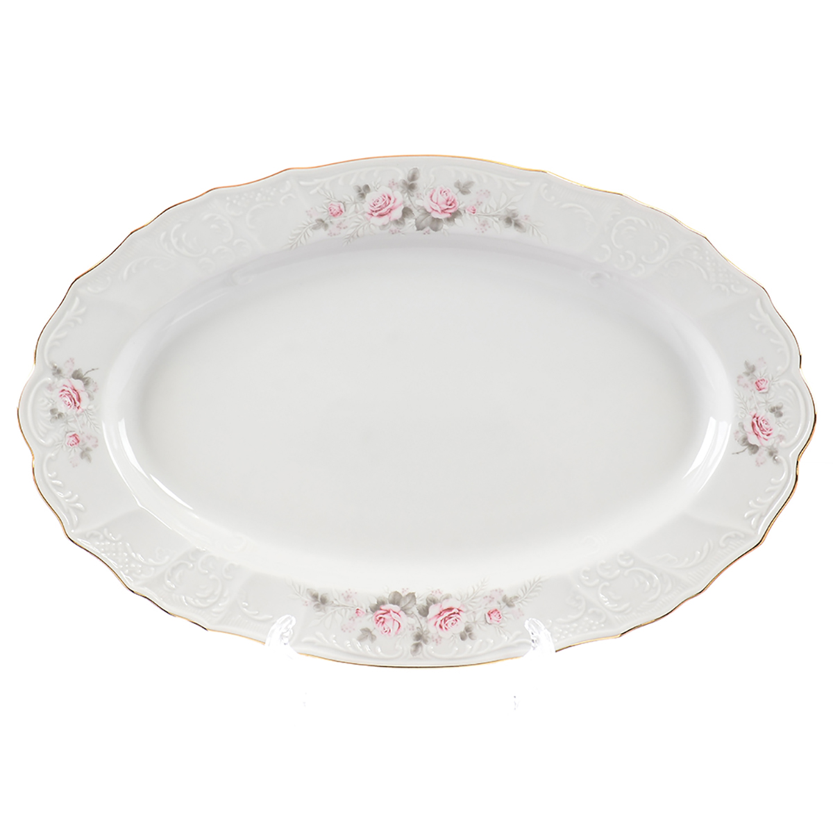 Блюдо овальное 36 см Бернадотт Серая роза золото Большое овальное блюдо, прекрасно декорированное и окантованное золотом, может нести любую функцию на вашем столе: от подачи горячих блюд и закусок, до выпечки и фруктов. Для фантазии нет предела, как нет предела совершенству фарфора от Бернадотт.