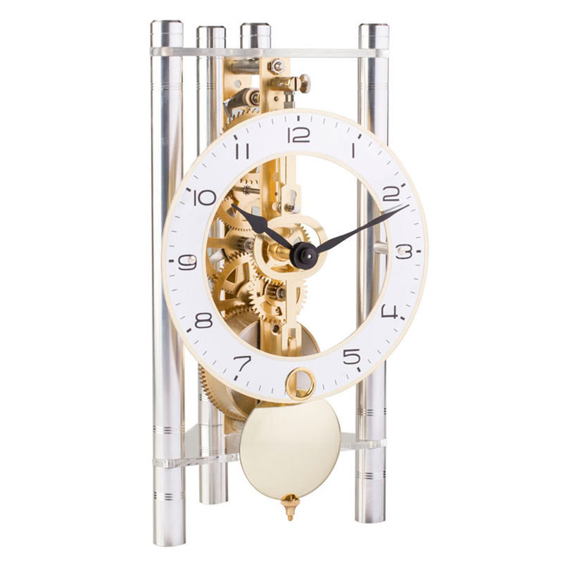 Настольные механические часы hermle 23024-x40721. Интерьерные механические часы Hermle 23024-X40721 Немецкая компания Hermle специализируется на производстве интерьерных часов. На сегодняшний день, успешно работает и cостовляет достойную конкуренцию на мировом часовом рынке, благодаря высокому качеству сборки, точностью и красотой исполнения. Механические настольные скелетонизированные часы с ручным заводом. Колонночки изготовлены из анодированного аллюминия. Минеральное стекло. Механизм латунный. Бой один удар каждый ровный час. Запас хода 8 дней Характеристики Hermle Hermle 23024-X40721 Размер: 20х11х9 см Механизм: механика. Материал: металл, стекло Производство: Германия Размер, см : 20х11х9 Цвет : Серебро Материал : Металл, Стекло Механизм : Механика Функции : Бой СКИДКИ : Индивидуальные