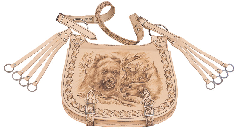Набор охотника "вепрь" в сумке из натуральной кожи (на 3 персоны). 1. Сумка из натуральной кожи стилизованная под охотничью сумку «ягдташ» с росписью ручной работы 1шт. 2. Фляжка из нержавеющей стали 0,5 л 1шт. 3. Нож охотничий из нержавеющей стали 1шт. 4. Штопор сомелье 1шт. 5. Стакан складной 3шт. 6. Вилка из нержавеющей стали 3шт. 7. Блюдо для мяса 3шт. 8. Чехол из спанбонда (нетканый мягкий материал) 1шт.