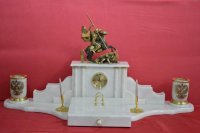 Письменные наборы из мрамора. Настольный набор из белого мрамора включает в себя: Часы настольные с фигуркой Георгия-победоносца -1шт. Стаканы для ручек и карандашей с позолоченными изображением двуглавых орлов -2шт. Подставка под бумаги - 2шт. Подставка с ручкой - 2шт. Ящик для ценностей - 1шт. Подставка под календарь - 1шт. Визитница -2шт. Ручки из мрамора-2шт. По вашим пожеланиям можно изменить комплектацию набора.