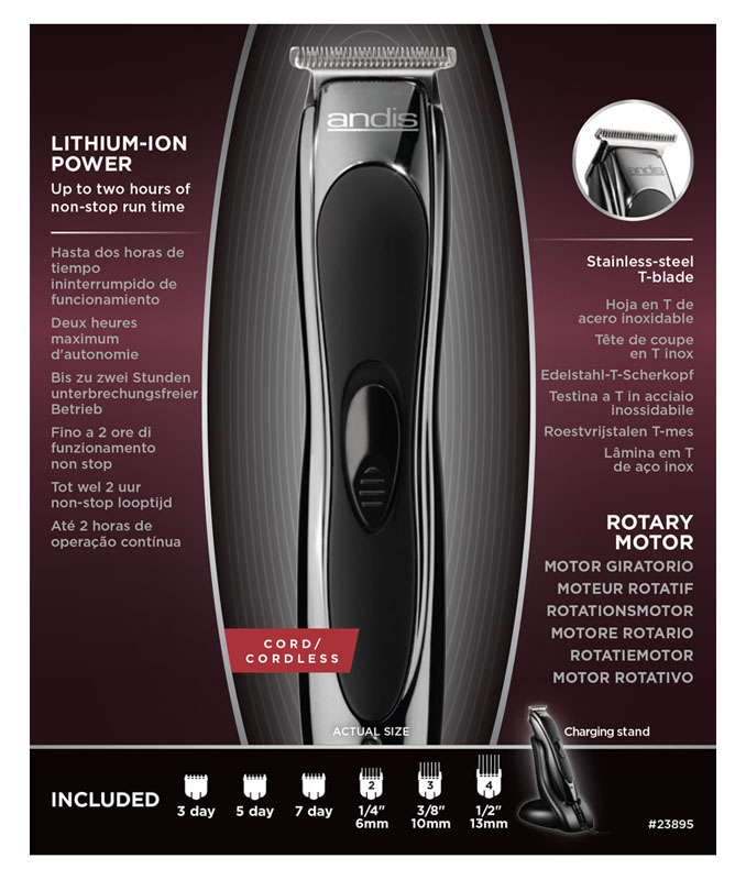 Триммер для стрижки волос slimline andis 23895 btf3. Аккумуляторно-сетевой триммер Andis Slimline 23895 BTF3 Аккумулятор – Li Ion Мощность: 2,45 Ватт Время автономной работы – 120 мин Время зарядки -150 мин Легкий вес –130 гр Скорость ножевого блока 6500 об/мин Металлический Т-нож, ширина – 32 мм Высота среза 0,1мм 6 насадок: 1,6мм #40 3 д. #41 , 2,4 мм #40 5 д. #41 , 3 мм #40 7д. #41 , 6 мм, 10 мм, 13 мм В комплекте триммера Andis 23895 Slimline BTF3: щеточка и масло Кол-во оборотов больше, чем у аналогов, на 500 об/мин. Есть насадки с очень маленькой установкой длины – для ювелирной обработки бороды и тушевки: 3 дня, 5 дней, 7 дней. Вставки Soft Toush предотвращают скольжение при работе! Аккумулятор Литий-ионный (Li-Ion) Тип Машинка-триммер для волос Вес 130 гр Дисплей Нет Высота насадки 1,6, 2,4, 3, 6, 10, 13 мм Высота среза 0,1 мм Материал ножа Металл Насадки 6 шт Питание Аккумуляторно-сетевая Регулировка высоты среза Нет Съемные ножи 1 шт Ширина ножа 32 мм Время работы от аккумулятора 120 мин Количество оборотов в минуту 6000 Прочие особенности В комплекте щеточка для чистки и масло Цвет Серебристый