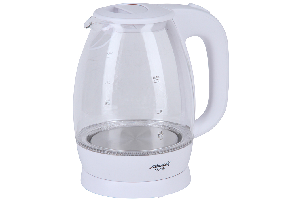 Эл.чайник ath-2465. Материал стекло Бренд Atlanta Страна КИТАЙ Корпус из термостойкого стекла, 1.7 л Иллюминация Ручка с покрытием от скольжения Поворот на подставке на 360° Быстрое закипание Фильтр от накипи Закрытый нагревательный элемент Автоматическое отключение Защита от перегрева без воды Электрошнур в цокольной подставке Мощность 2000 Вт, 230V, 50Hz.  развернуть описание ▼