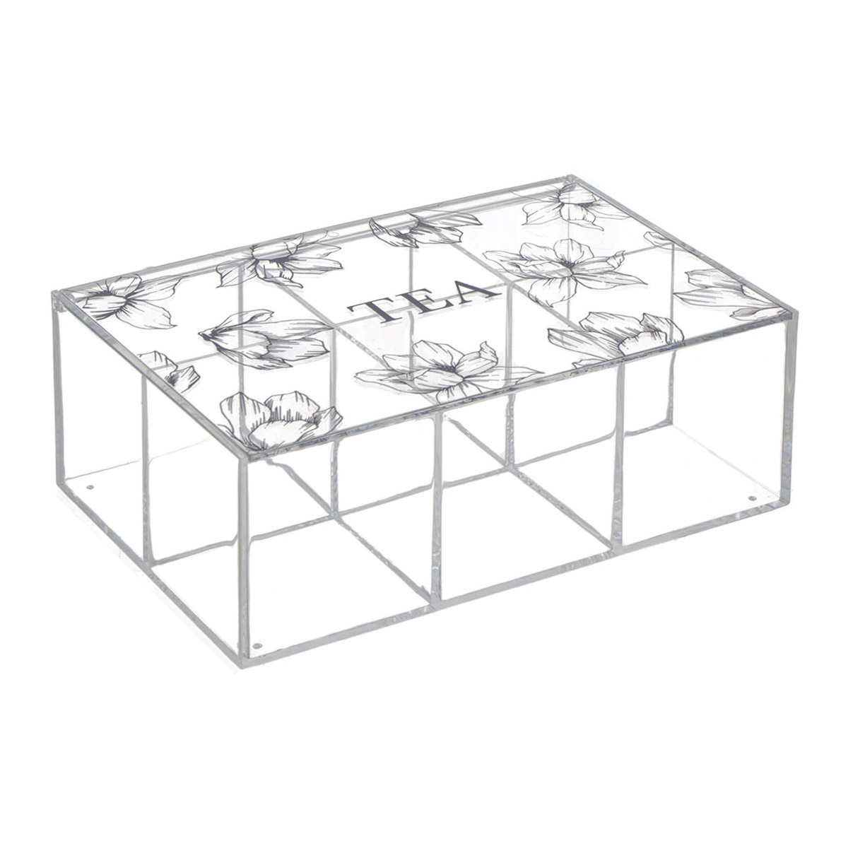 Оригинальность изделию придают стильный прозрачный цвет изделия и принт с цветочным орнаментом и тематическим текстом на крышке. Такой дизайн позволяет коробке для чайных пакетиков стать украшением любой кухни.