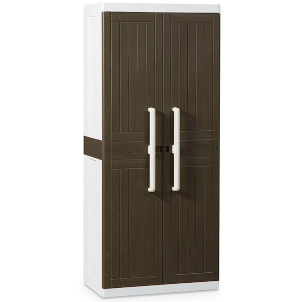 Уличный шкаф toomax wood line s 255b 2х дверный узкий коричневый. Уличный шкаф TOOMAX используется для удобного хранения всевозможного инвентаря на улице, а также в доме. У уличных шкафов множество преимуществ, среди которых: вместительность, прочность, долговечность. Благодаря эстетичному внешнему виду, шкаф отлично впишется в интерьер вашего участка. • Основные плюсы: 4 полочки, вместительный, нет ножек • Размер: 65x37x165 см • Вес нетто: 11,5 кг • Материал: пластик + имитация под дерево • Цвет: молочный + дверцы коричневые • Дверцы: 2 штуки • Комплектация: 4 переставные полки • Устойчивость к низким температурам: да • Запираемый: да • Максимальная нагрузка на полку: 20 кг • Размер упаковки: 65x37x85 см • Вес брутто: 12,51 кг • Страна: Италия