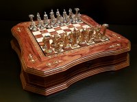 Шахматы легион роза антик. Подарочные нарды в виде старинной книги. Изготовлены из массива красного дерева махагон. Каждая игровая фишка имеет гравировку с гербом России. В комплект входят: игровая доска, фишки дубовые с гравировкой (d28 мм) - 30 шт., пластиковые зари - 2 шт. Размер в сложенном виде - 60х35х6 см, в разложенном - 60х70х3 см. Размер 40х40х7 см Вес 4,5 кг Исполнение инкрустация / маркетри Материал доски орех Тип доски ларец с крышкой Высота короля 7 см Высота пешки 5 см Материал фигур бронза Производитель Helena Wood Art Страна производства Турция Упаковка фирменная сумка-чехол