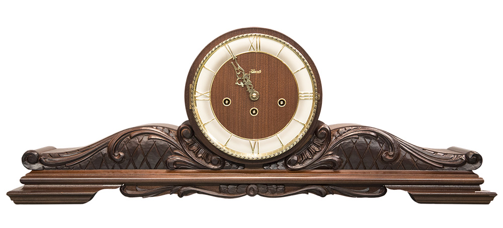 Часы настольные hermle 21116-030340. Каминные часы Hermle 21116-030340 Модель 21116-030340 из классической серии выполнена в старинном стиле. Настольные механические часы «облачены» в элегантный корпус со сложной художественной декоративной отделкой. Цилиндр с циферблатом помещен в центре подставки, стилизованной под раскрытую книгу, украшенную витиеватой резьбой. В результате специальной обработки древесины корпус приобрел красивый ореховый оттенок. Эмалированный циферблат с римскими цифрами и деревянной вставкой по центру 0340 - механизм с плавающим балансом и пружинным заводом. Запас хода - 8 дней. Бой каждые 15 минут с нарастанием длительности мелодии. Мелодия - Вестминстер Ночной режим - отсутствует Материал корпуса дерево Механизм механика, пружинный завод Размер часов 71х27х16 см