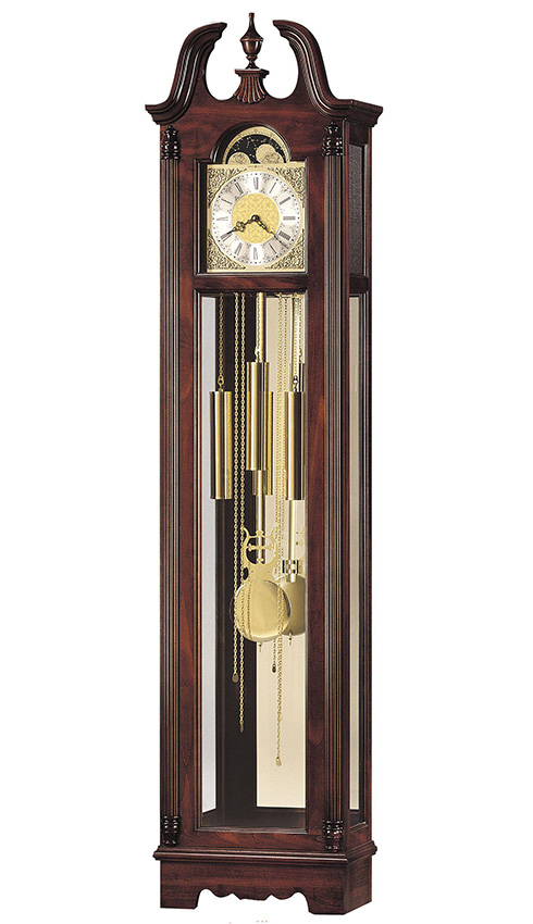 Часы напольные howard miller 610-733. НАПОЛЬНЫЕ ЧАСЫ HOWARD MILLER 610-733 NOTTINGHAM (НОТТИНГЕМ) Эти часы украшены элегантным фронтоном в виде «лебединых шей», изящным навершием в форме кубка и резной раковиной. Циферблат из полированной латуни состоит из центрального диска золотого цвета, богато украшенного узорами, и посеребренной внешней окружности. Имитация лунного календаря подчеркивает изысканность циферблата. Внутренняя подсветка, задняя зеркальная стенка и основание корпуса акцентируют внимание на латунном маятнике. Кварцевый механизм, две мелодии («Вестминстер» и «Аве Мария»), регулируемая громкость звука и автоматическое ночное отключение мелодии и боя. Корпус изготовлен из отборных пород твердого дерева. Тонирование и полировка корпуса выполнены в цвете Виндзорской Вишни (Windsor Cherry). Цвет корпуса Коричневый Элемент питания 2xC и 2xD Батарейки не включены в поставку. Сделано в США. Мелодии: howard-miller-2-chimes-westminster howard-miller-2-chimes-ava-maria Материал корпуса дерево Механизм кварцевый Размер часов 196 x 47 x 26 см