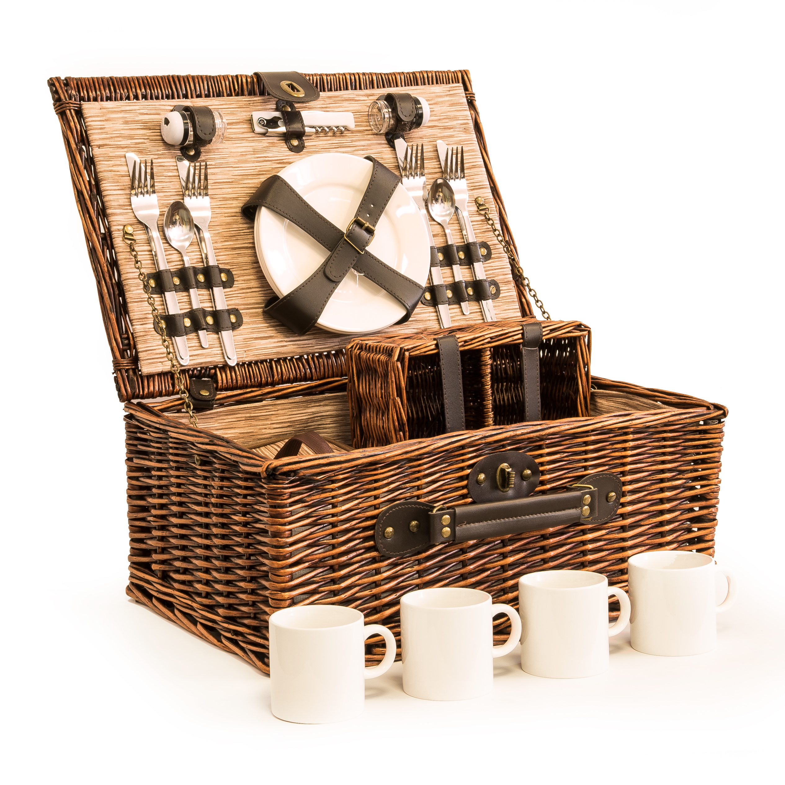 Пикниковый набор в корзине на 4 персоны цвет шоколад серия люкс. Размер: 46х31х21см. Вес 4,8кг. Состав: Плетёная корзина для пикника, 4 металлические ложки, 4 металлические вилки, 4 металлических ножа, 4 керамических тарелки, 4 керамические кружки, нож-открывалка, солонка и перечница, сумка-холодильник. Набор для пикника в удобной корзине обшитой изнутри тканью. Предназначен для четырех персон. Керамические чашки уложены в специальную плетёную подставку. Материал, из которого выполнены столовые элементы - пищевая сталь. В комплект входят удобные перечница и солонка. Корзина имеет специальные хлястики для удержания всех элементов набора. Крышка плетеной корзины крепится на две цепочки, размещенные по боках. Набор отлично подойдет для загородных мероприятий. Компактный, удобный и практичный.