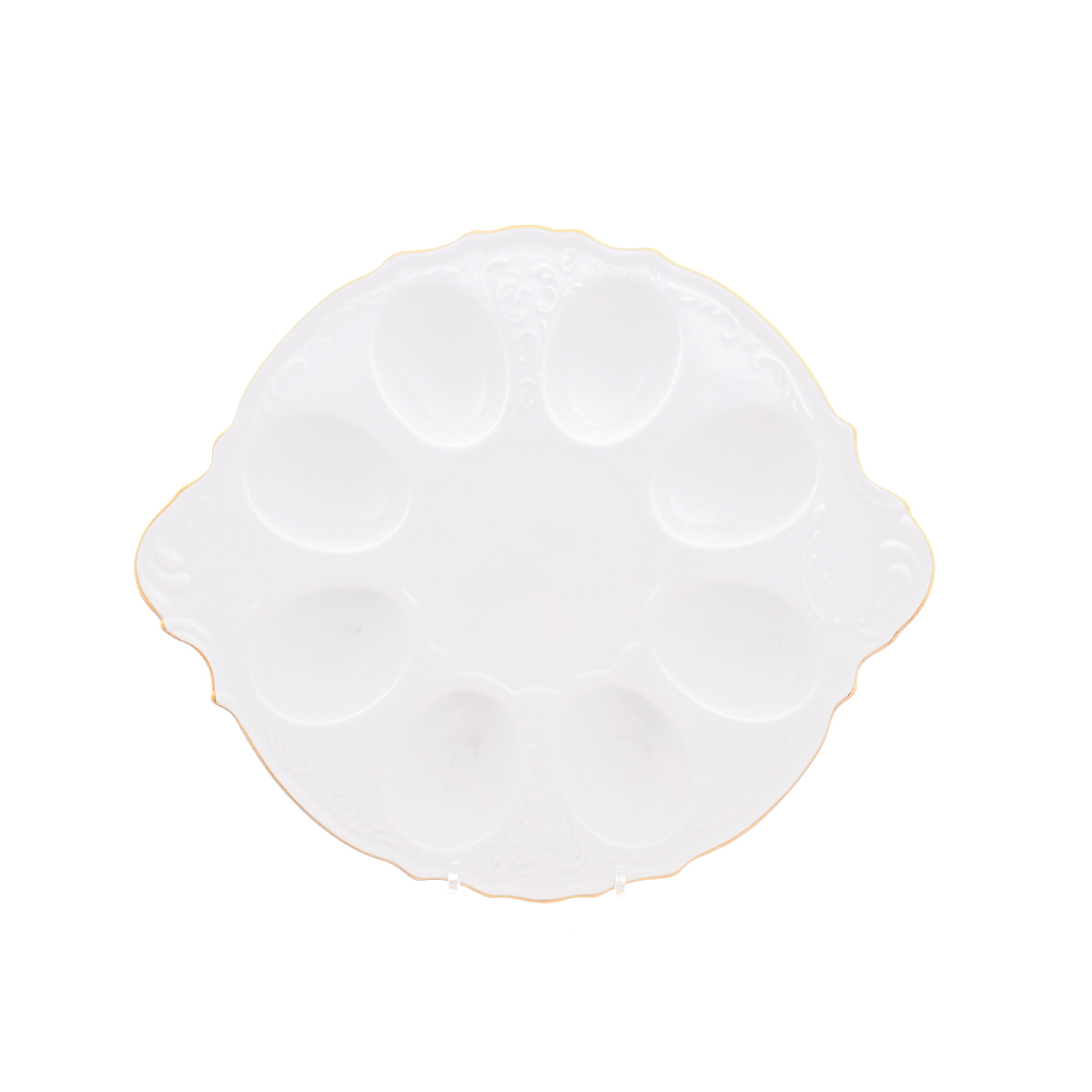 Для идеальной подачи фаршированных яиц, целых и половинками, а также для создания яркого акцента сервировки. Поднос для яиц Bernadotte Белый узор будет долго радовать вас своими безупречными формами и утонченным дизайном! Фаршированные яйца или крашенки во время пасхальных праздников будут замечательно смотреться на таком блюде! Диаметр: 25 см, удобные ушки-ручки по бокам изделия.