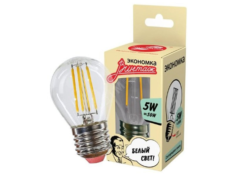 Лампа светодиодная ecoledfl5wgl45e2745 экономка филамент. Материал стекло Бренд ЭКОНОМКА Страна РОССИЯ Товар сертифицирован: Да Тип: светодиодная Тип цоколя: E27 Мощность лампы #40;потребляемая #41;: 5 Вт Цветовая температура: 4500 K Напряжение: 160—260 V Яркость: 450 LM Длина лампы: 79 мм Срок службы: 30000 часов