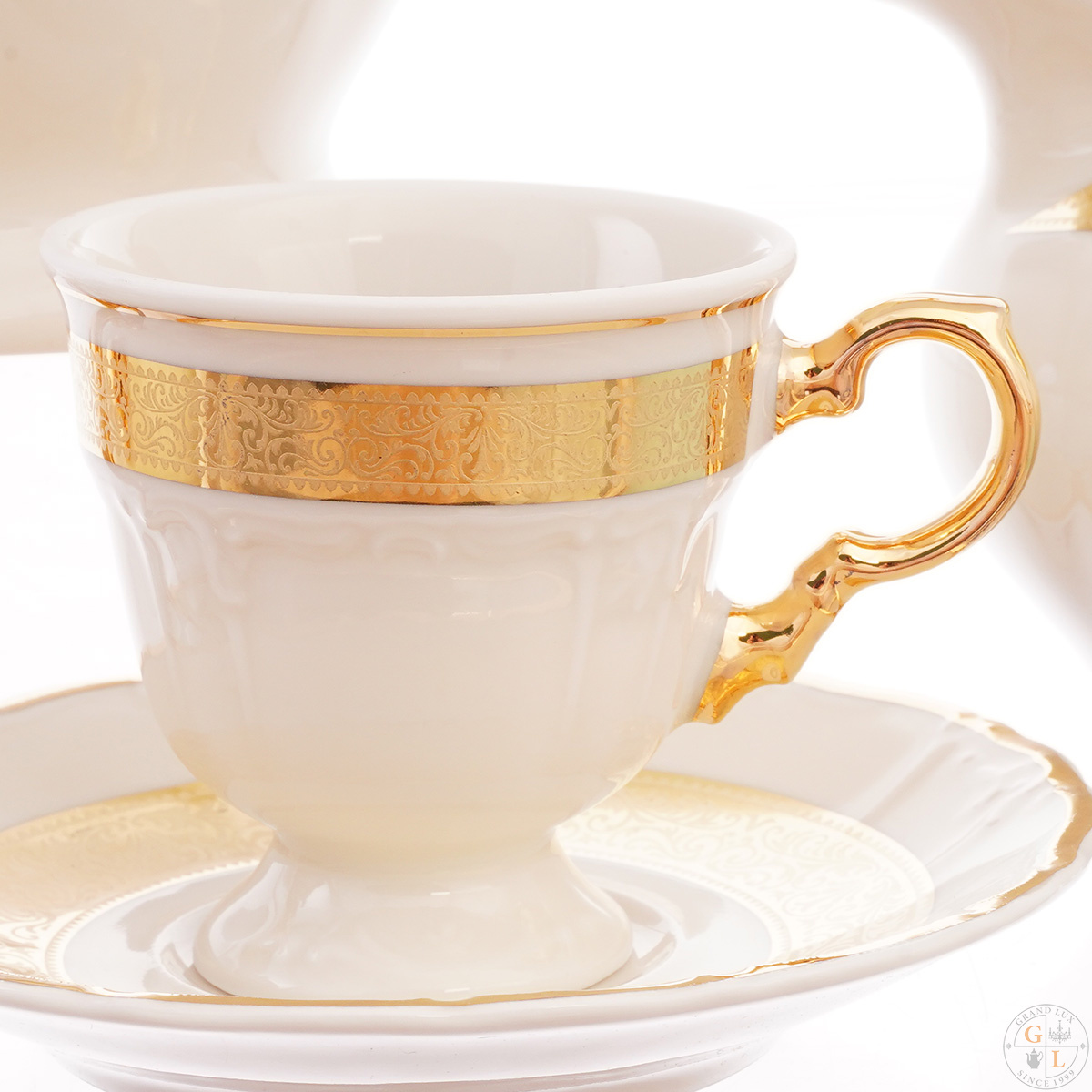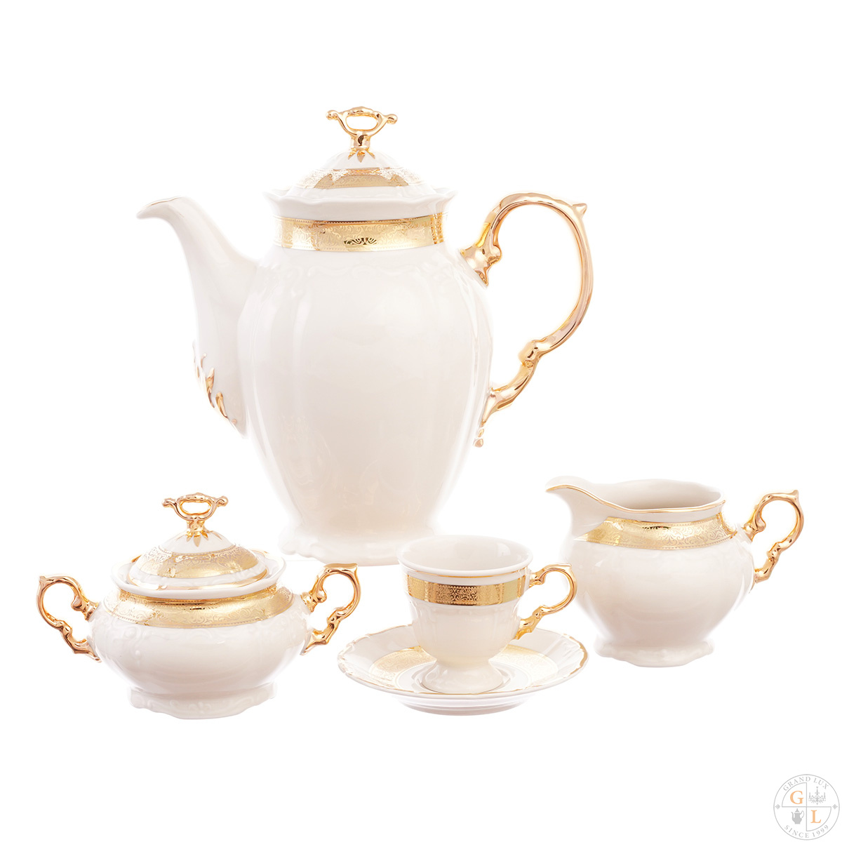 Кофейный сервиз thun мария луиза золотая лента ivory 6 персон 17 предметов. Кофейный сервиз Thun Мария Луиза золотая лента Ivory 6 персон 17 предметов Красивейший кофейный сервиз из 17 предметов, в котором есть все для того, чтобы провести приятный вечер в кругу друзей и близких за ароматным свежезаваренным кофе. Белоснежность костяного фарфора оттеняют полосы сверкающей позолоты, декорированной вензелями. Добавляют воздушности предметам сервировки ажурные ручки на крышках и по бокам изделий. Состав набора: кофейник с крышкой 1,20 л - 1 шт (140*270 мм)* молочник 180 мл - 1 шт (70*73 мм)* сахарница 220 мл - 1 шт (90*120 мм)* чашка 90 мл - 6 шт (59*58 мм) * блюдце 14 см - 6 шт* Тип товара Кофейные сервизы и наборы (Чехия, Фарфор, Thun) Страна происхождения Чехия Материал Фарфор Бренд Thun Серия Мария Луиза Золотая лента Ivory Назначение Предмет домашнего обихода из фарфора Длина/Ширина/Высота, см 32/29/22