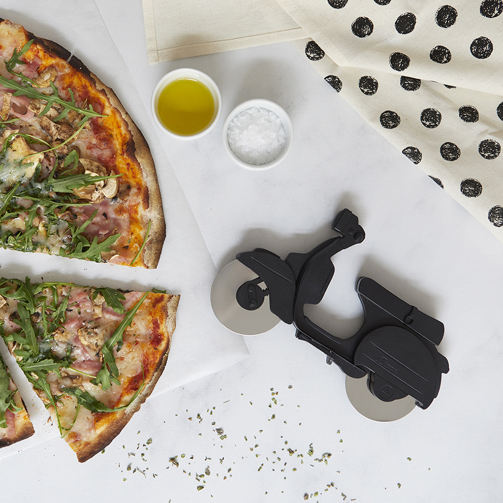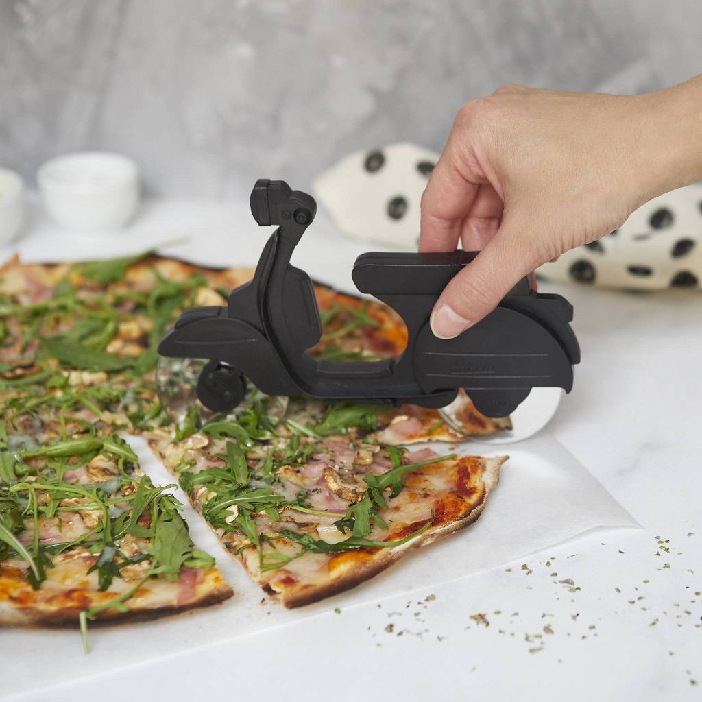 Нож для пиццы scooter черный. Этот необычный нож-скутер – оригинальный и полезный аксессуар от испанского бренда Balvi, который пригодится для быстрого разделения горячей пиццы или пирога на равные кусочки. Нож оснащен сразу двумя лезвиями из нержавеющей стали, которые замаскированны под колеса скутера. Сама же пластиковая основа в виде черного скутера служит рукояткой ножа и предотвратит от случайных порезов. Необычный и яркий дизайн ножа в виде скутера, безусловно, добавит итальянского колорита при подаче вкусной и аппетитной пиццы на стол. Наслаждайтесь своим любимым лакомством, не опасаясь порезов и нарушения структуры вкусной пиццы. • Необычный дизайн ножа для пиццы в виде скутера • Благодаря двум лезвиям пицца идеально разделится на кусочки • Ножи выполнены из прочной нержавеющей стали  развернуть описание ▼