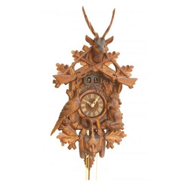 Настенные часы с кукушкой rombach & haas 5650. Настенные часы с кукушкой Rombach & Haas 5650 Часы с кукушкой Rombach & Haas 5650 имеют надежный механизм. Музыкальные часы с двумя дверцами. Такие часы производят с 1870 года. Они оборудованы музыкальным вальцем с двойным проигрыванием. Часы высшего качества. Ручная работа. Сделаны из мореного дерева, с филигранной резьбой на тему охоты. Фасад украшен охотничьими трофеями, зайцем и фазаном, а вверху часов расположена голова оленя. Римский циферблат, резные стрелки. Характеристики часов с кукушкой Rombach & Haas 5650: Размер: 80х42х33 см Материал корпуса - дерево (мореное). Механизм: механика, завод на 8 дней. Производство Германия.