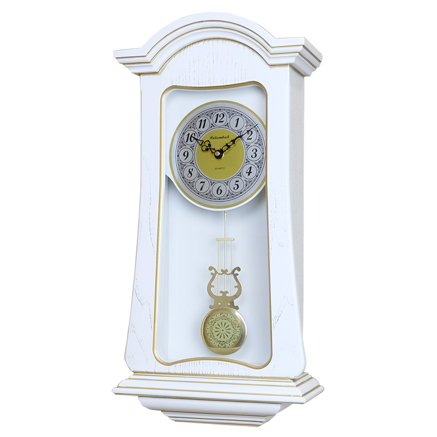 Настенные часы columbus co-1828-pg-wh. Деревянные настенные часы Columbus Co-1828-PG-WH Настенные часы Columbus Co-1828-PG-WH с маятником и боем имеют надежный кварцевый механизм. работающий от батареек. Корпус : натуральное дерево с резным фронтоном. Механизм : кварцевый. Размер: 60,5х30х12,5 см Цвет: Белый с золотой патиной. Мелодия : 4 типа - Westminster и часовой бой (в разных сочетаниях). Есть вариант -только бой Почасовой по количеству часов и получасовой 1 раз. Программное отключение звука с 22. 00 до 5. 00 часов Питание : 4 элемента типа АА (R6). В комплект не входят. Вес в упаковке : 4. 5 кг Размер, см : 60,5х30х12,5 Цвет : Белый с золотой патиной Материал : Дерево Механизм : Кварцевый Функции : Мелодия, Бой, Ночной режим