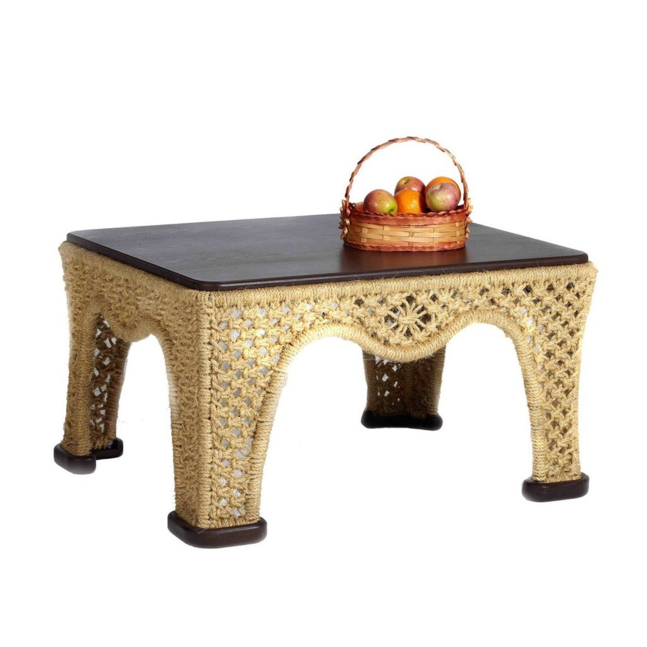 благодаря своим габаритам, он позволит разместить за ним все необходимое.В его основе металлический каркас, благодаря чему столик прочен и устойчив. Каркас обвязан нитями из сизаля в особой технике макраме. Сизальное волокно изготавливается из мексиканского растения агавы и обладает высокой прочностью, износоустойчивостью и долговечностью. Столешница выполнена из водостойкой фанеры с пропиткой и покрыта лаком laquo