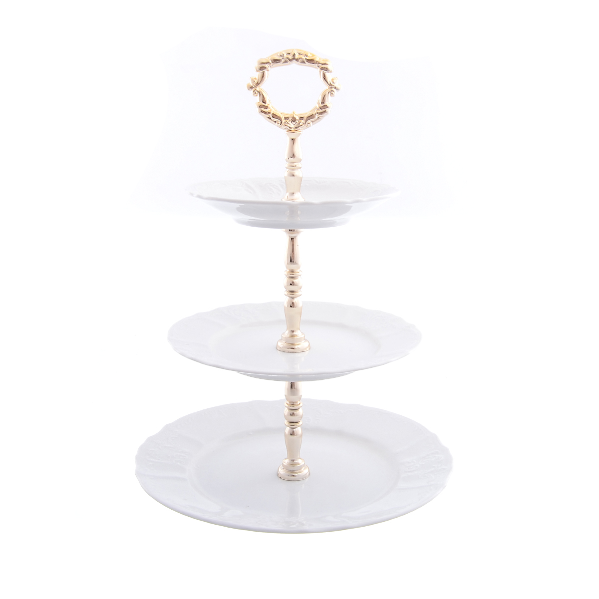 Этажерка (горка) золотой стержень bernadotte недекорированный 3 яруса. Этажерка (Горка) 3 яруса золотой стержень Бернадотт Уют всегда создается из приятных мелочей и оригинальных предметов сервировки. Таких, как трехъярусная этажерка из чешского фарфора на золотой ножке. Ее удобно переносить, благодаря ручке-кольцу, а три яруса позволят подать гостям всевозможные вкусности, сэкономив при этом место на столе. Тип товара Фруктовницы, горки, этажерки (Чехия, Фарфор, Bernadotte) Страна происхождения Чехия Материал Фарфор Бренд Bernadotte Серия Недекорированный Назначение Предмет домашнего обихода из фарфора
