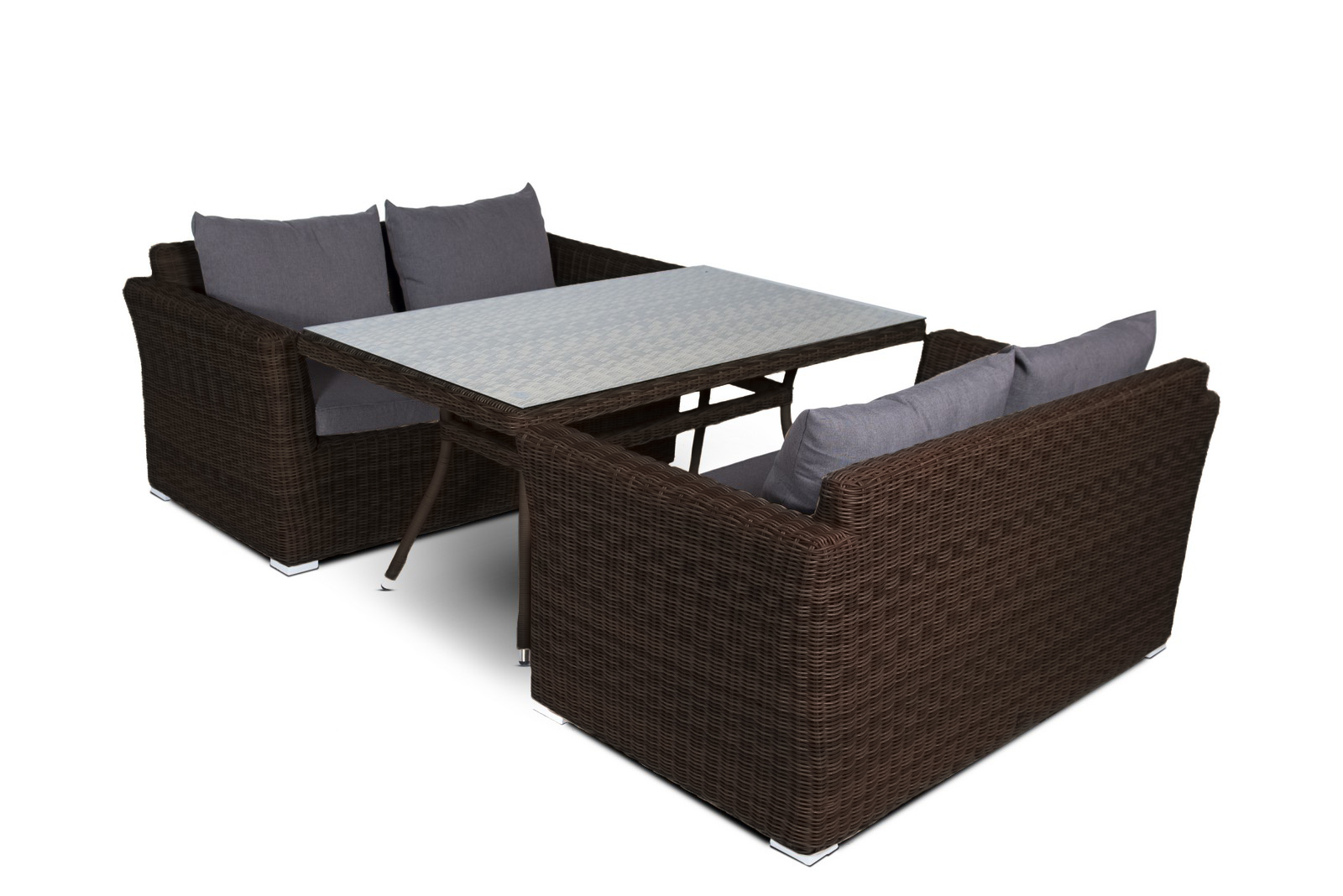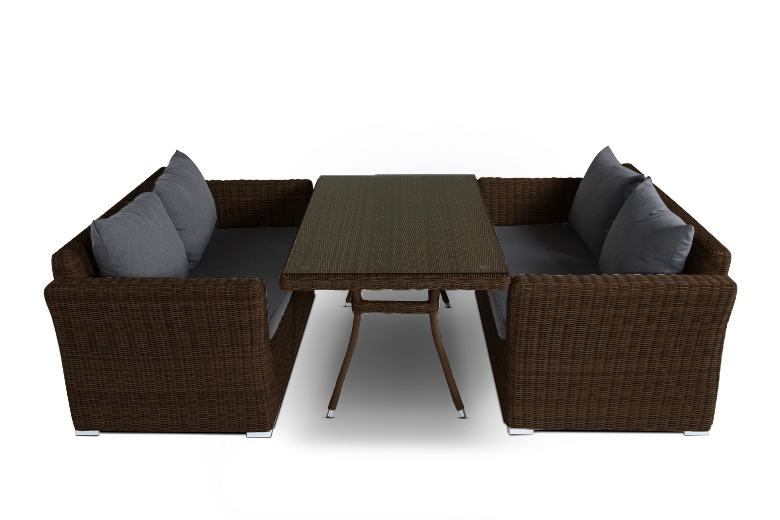 Мокко, обеденная группа, коричневый цвет. Обеденная группа из искусственного ротанга: 2 двухместных дивана и обеденный стол со стеклянной столешницей. Алюминиевый каркас, искусственный ротанг, круглое плетение,съемные чехлы серого цвета, ручная работа. Материал каркаса Искусственный ротанг, алюминий Материал подушки полиэстер 100% плотностью 230гр/м2 с влагоотталкивающей пропиткой Вес 88кг