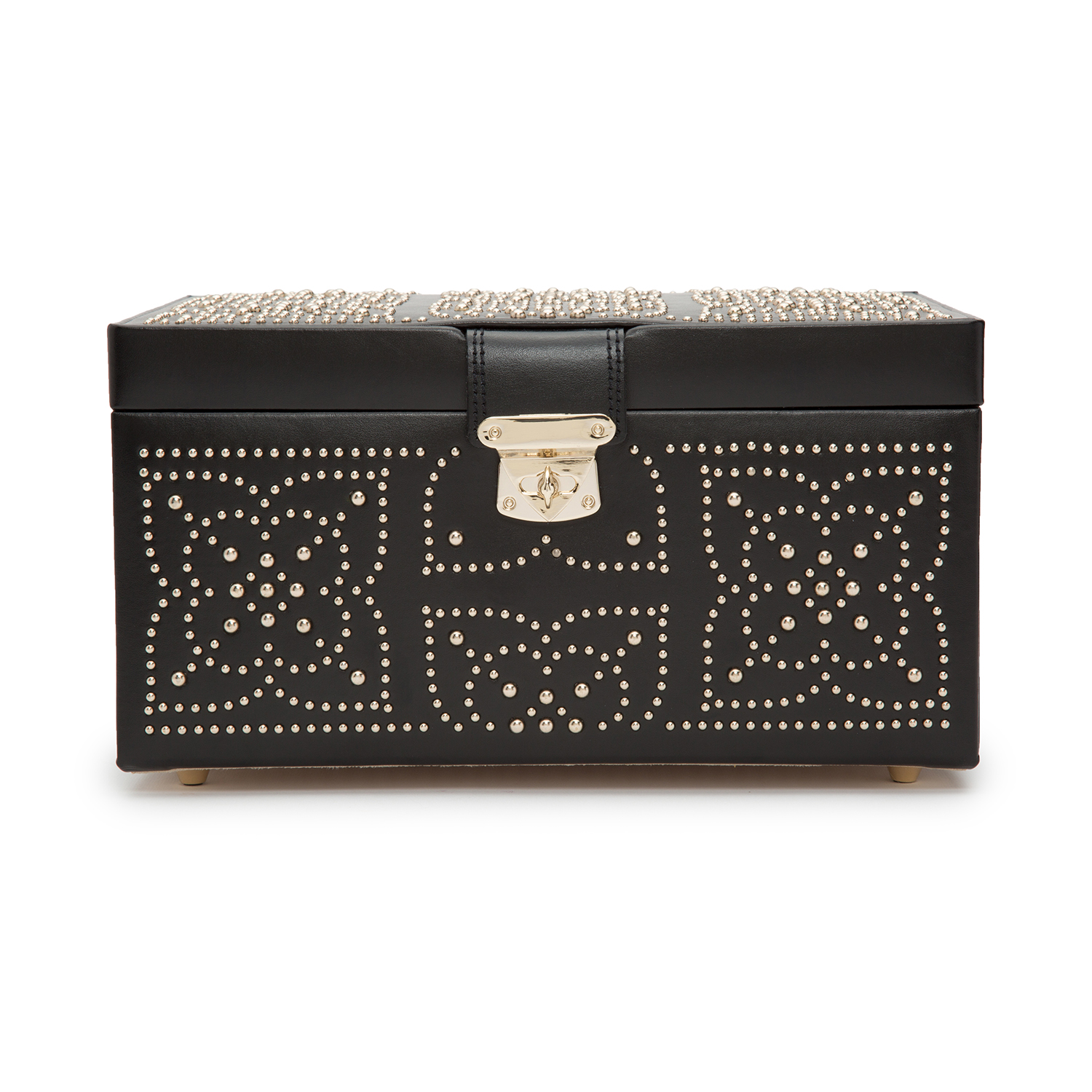 Wolf 308102 большая шкатлука для украшений из серии marrakesh. Серия Marrakesh Категория для украшений Упаковка эксклюзивная подарочая коробка Страна производства Англия Цвет чёрный Размер 15,2 x 27,9 x 20,3 см Материал натуральная кожа Изделия из серии "Marrakesh" выполнены с изящными узорами мозаек из золотых клёпок. Большая шкатулка для украшений и аксессуаров из черной кожи, с зеркалом, металлическими деталями золотого цвета, наполнитель с технологией LusterLoc™ против помутнения металлических деталей, 5 роллов для колец, 17 ячеек и дорожная шкатулка (3 ролла для колец и 1 ячейка). Бренд Wolf  развернуть описание ▼