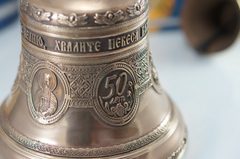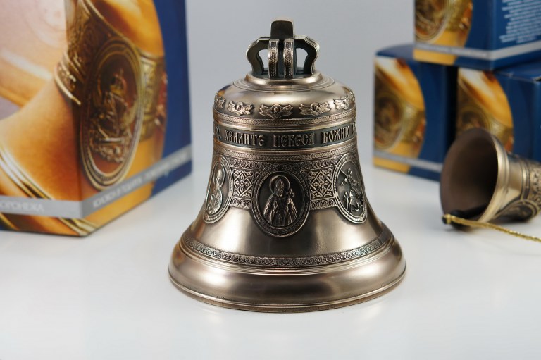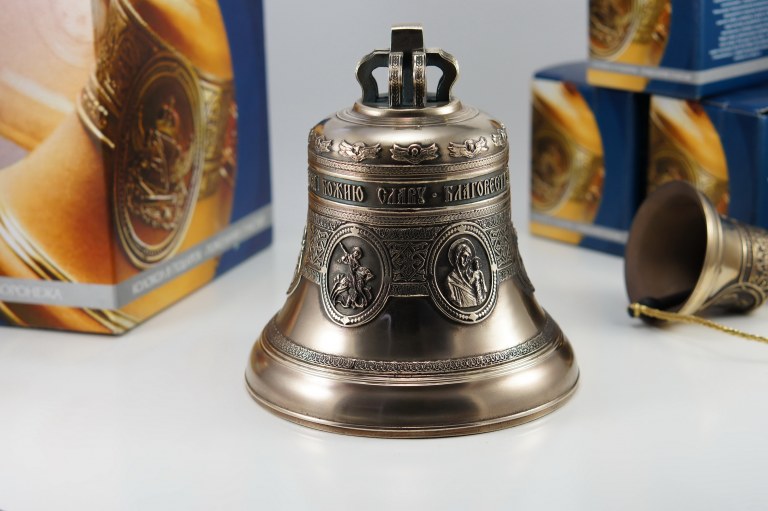 Колокол 3кг юбилейный пять ликов святых. Колокол будет эксклюзивным и дорогим подарком, который оценят по достоинству (иконы могут быть изменены по вашему желанию, а также колокол может быть дополненен индивидуальной надписью). Колокол с шестью иконами Святых: Господь Вседержитель, Казанская икона Божией Матери, Св.прп.Сергий Радонежский, Св.Вмч.Георгий Победоносец, Святитель Николай Чудотворец, Св.Митрофан Воронежский (иконы и дата могут быть изменены по желанию заказчика) Поверхность тонирована Надпись: БЛАГОВЕСТВУЙ ЗЕМЛЕ РАДОСТЬ ВЕЛИЮ, ХВАЛИТЕ НЕБЕСА БОЖИЮ СЛАВУ Уважаемые покупатели, просим обратить внимание что каждый колокольчик ручной работы и может незначительно отличаться от фотографий.