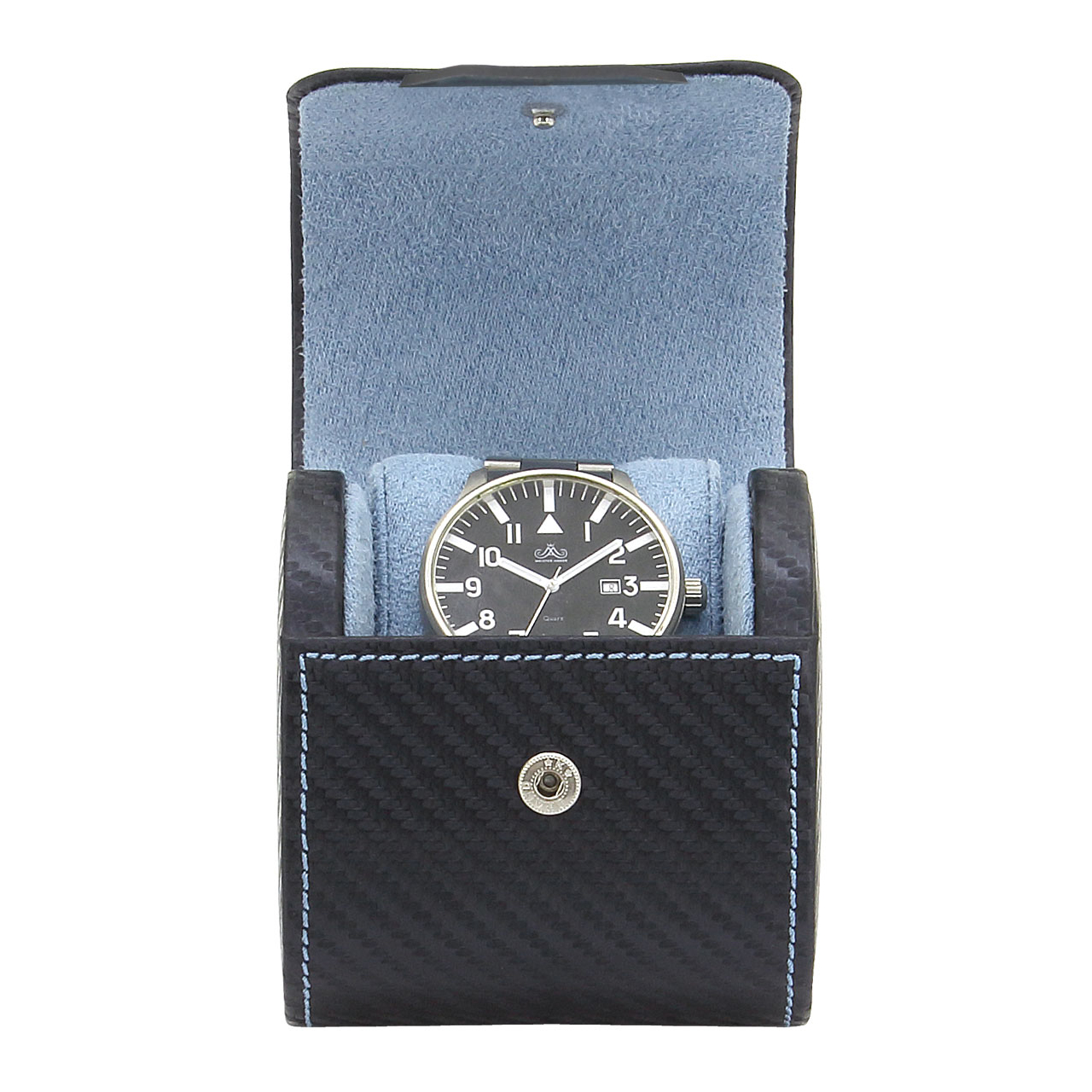 Футляр для 1-х часов carbon артикул 32057-5. Кол-во часов: 1 Бренд: Friedrich Lederwaren (Германия) Габариты: 8,5x7x9,5 см, вес 200 г Материал корпуса: Экокожа Цвет: Синий Футляр для 1-х часов Carbon Артикул 32057-5 Чудесный ролл для хранения одних часов выполнен из качественной экокожи, синего цвета с тиснением под карбон, станет отличным выбором для презента дорогому мужчине. Закрывается плотно на металлическую клипсу. Внутреннее оформление- отличный и мягкий серо-голубой велюр