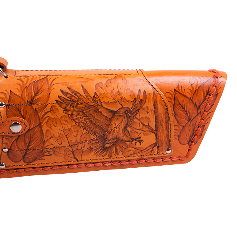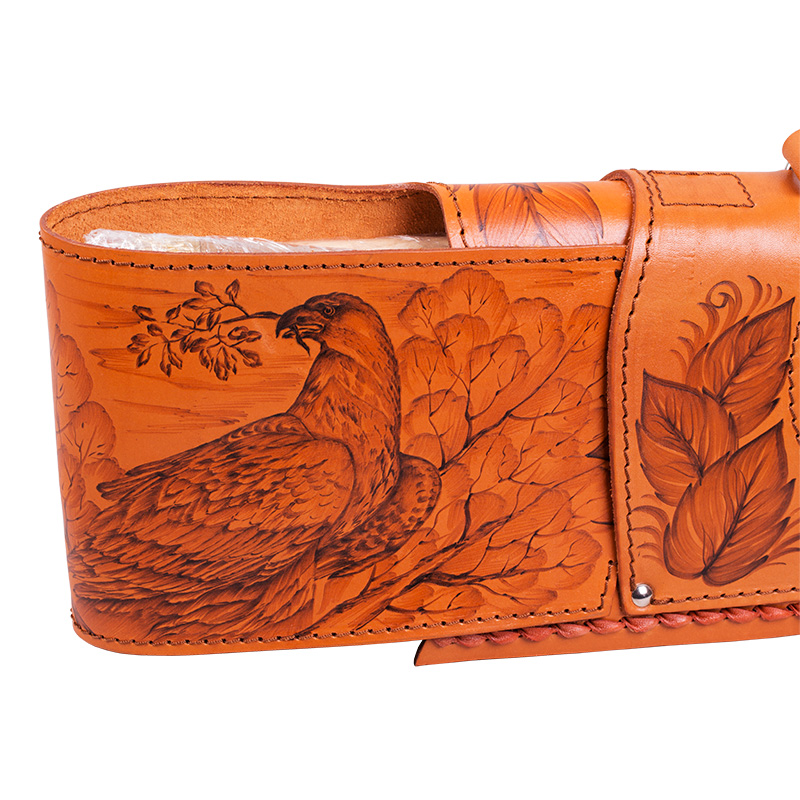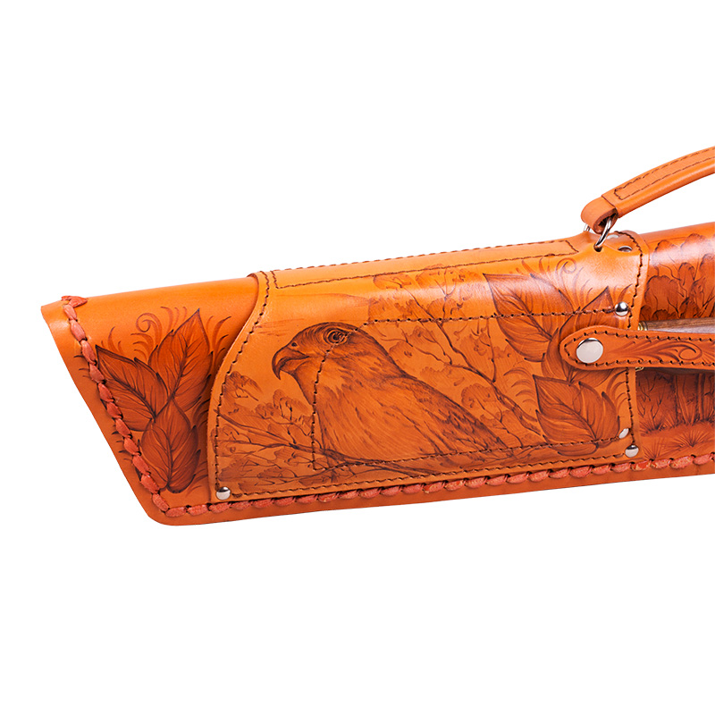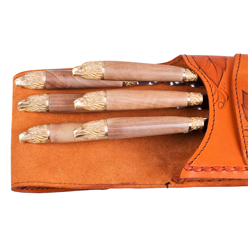 323нм6 шампурница подарочная «ружье». 1. Шампурница из натуральной кожи в виде чехла ружья (производится в 2 цветовых вариантах: темно-коричневый без рисунков либо желто-оранжевый с росписью ручной работы) 1шт. 2. Шампур длиной с рукоятью из ореха и латуни в виде головы орла (общая длина шампура — 69 см: длина полотна — 54 см, длина рукояти — 15 см) 6шт. 3. Мангал складной 1шт. 4. Нож-тяпка (топорик) с рукоятью из латуни и ореха 1шт. 5. Нож охотничий разделочный с рукоятью из латуни и ореха 1шт. 6. Чехол из спанбонда (нетканый мягкий материал) 1шт.