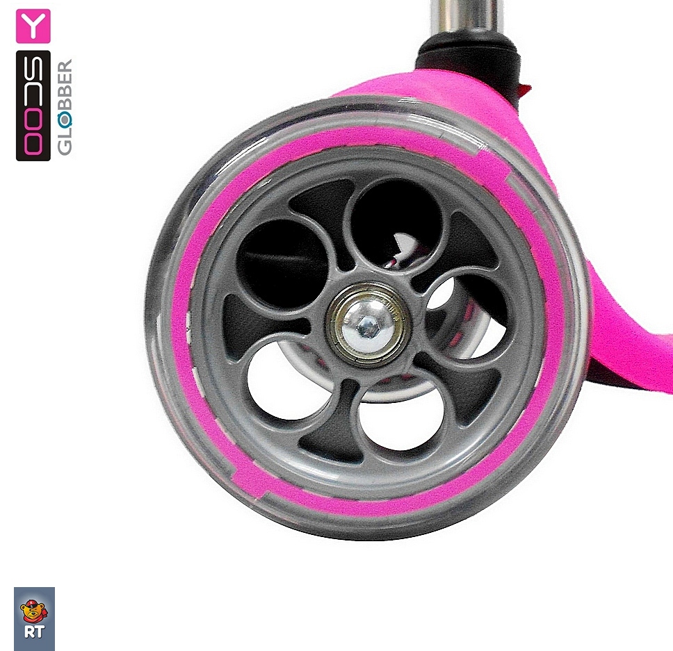 Самокат y-scoo rt globber my free fixed pink с блокировкой колес. Встречайте новинку 2016 от Y-SCOO- Globber My Free FIXED с блокировкой передних колес. Очень дорогое черное матовое покрытие на ручке самоката с красивыми буквами Globber. Материал колес - полый, новая форма и цвет дисков -теперь от них невозможно оторвать взгляд. Рисунок дисков мы назвали пять планет. Колеса могут быть черными или прозрачными. Этот инновационный самокат с глобальным подходом к созданию самоката, идеально подходит для развития ребенка. Поэтому он и получил название Globber. Он глобален еще в том, что растет вместе с Вашим ребенком от 2 до 6 лет. Новая концепция в дизайне 3-х колесного самоката. Новая концепция в управлении. Заблокируйте 2 передних колеса простой кнопкой, чтобы малыш не смог завалиться на бок. Это уникальная находка наших инженеров- она поможет любому малышу в процессе обучения катанию на самокате. С этой инновационной функцией замка Ваш ребенок не упадет с самоката при обучению езде. А устойчивость самоката придаст малышу дополнительную уверенность. Он легко и бесстрашно будет осваивать самокат. Если Вы ищите первый самокат для своего малыша- нет самоката лучше Globber. Уникальная разработка платформы с выступающими бортиками по краям не даст ножке малыша соскользнуть с платформы. Мы также тщательно продумали форму платформы, на которой ноги малыша не будут уставать. Мы укрепили платформу тонкой и прочной стальной пластиной. Теперь малыш может прыгать на самокате –он выдержит любую нагрузку. Платформа имеет антискользящую поверхность. 2 передних колеса диаметром 121мм, и 1 заднее колесо диаметром 80 мм изготовлены из высококачественного полиуретана PU HQ (high quality)с нейлоновым наполнителем. Материал колеса HQ имеет высокую степень отскока. Высокоточные и скоростные подшипники ABEC 5 608ZZ. Алюминиевая ручка не меняется по высоте. Инновация - Безопасность обучения:Единственная в мире запатентованная система блокировки передних колес. Часто дети , которые только обучаются езде на самокатах с такой системой- наклон вправо- поворот вправо, наклон ручки влево- поворот влево, не умея еще уверенно держать равновесие, заваливаются на бок. Инженеры творческой мысли создали инновационную систему блокировки колес. Таким образом, чтобы помочь ребенку сначала освоить самокат , Вы сможете заблокировать колеса ( нажать на кнопку сверху панели самоката), и малыш спокойно может сначала учиться ездить только вперед. А потом, разблокировав колеса (нажать на красную кнопку под самокатом), Вы можете показать и научить малыша поворачивать, не боясь, что он упадет на бок. Это очень безопасно и легко при первых уроках обучению на самокате. Эргономика ручек на руле:Эргономичные прорезиненные ручки из эластичного двухкомпонентного материала с добавлением латекса необыкновенной формы. Впервые для большего комфорта мы удлинили ручки. Эргономика 10 баллов. Комфорт и большая износостойкость. Рулевое управление с усилителем:Продольные оси вращения (опоры передних колес) смонтированы на шарикоподшипниках для облегчения рулевого управления. Безопасность и долговечность:Более длинный тормоз для быстрой и безопасной остановки. Мы продумали покрытие заднего колеса- теперь торможение происходит быстрее . А колесу не страшна никакая деформация. Комфорт в использовании:Низкая платформа для большей устойчи