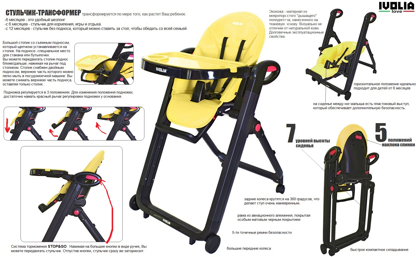Стульчик для кормления ivolia love 02 4 колеса yellow. Новинка от - стульчик для кормления IVOLIA LOVE. Бренд, рожденный в Италии, поразит своим дизайном и высоким качеством. Впервые стульчик смело можно рекомендовать для детей от 6 месяцев, потому что у стульчика есть горизонтальное положение сиденья. Сиденье очень удобное. Эргономика - 10 баллов. Рама из авиационного алюминия, покрытая особым матовым черным покрытием. В производстве стульчика использованы самые современные высококачественные материалы: матовый пластик с тефлоновым покрытием против царапин (царапины будут не видны и стульчик долго не потеряет свой первоначальный облик); экокожа, из которой сделан чехол на сиденье. За ней очень легко и практично ухаживать. Экокожа - материал из микропористого дышащего полиуретана, нанесенного на тканевую основу из натуральных или полиэфирных материалов. Уникальный материал, обладающий всеми лучшими качествами натуральной кожи и не имеющий ее недостатков. Имеет прекрасные гигиенические свойства, не требует специального ухода, прочен, легок и износостоек. Визуально не отличим от натуральной кожи. Долговечные эксплуатационные свойства. Стульчик для кормления IVOLIA- трансформер, который может трансформироваться по мере того, как растет Ваш ребенок:-6 месяцев - это удобный шезлонг-с 6 месяцев - стульчик для кормления, игры и отдыха. -с 12 месяцев - стульчик без подноса, который можно ставить за стол, чтобы обедать со всей семьей. Особенности стульчика IVOLIA LOVE:-стильный дизайн-самые дорогие высокотехнологичные материалы. Один только чехол на сиденье из экокожи покорит своей красотой и практичностью. -система торможения STOP GO. Чтобы передвинуть стульчик, нажмите обе красные кнопки рычага ручного тормоза. Нажимая на большие кнопки в виде ручек, Вы можете передвигать стульчик. Отпустив кнопки, стульчик сразу же затормозит. Это очень удобно для транспортировки стульчика по комнате. -удобное сиденье, регулируемое до горизонтального положения. -большие передние колеса, задние колеса крутятся на 360 градусов, что делает стул очень маневренным. -большой столик со съемным подносом-на подносе- специальное место для стакана или бутылочки. -на сиденье между ног малыша есть пластиковый выступ, который обеспечивает дополнительную безопасность. -5-ти точечные ремни безопасности. -быстрое компактное складывание. Стульчик не занимает много места. Эта модель выгодно отличается от своих собратьев- внешне стульчик больше похож на стильный предмет мебели, привезенный с последней итальянской выставки мебели. СИДЕНЬЕ:Регулируемое сиденье поможет найти самое удобное положение для Вашего ребенка. Нажимая рычаги регулировки высоты сиденья, Вы сможете менять высоту сиденья в 7 положениях. Отрегулируйте высоту сиденья для дальнейшего удобного и безопасного использования стула. Благодаря рычагу сзади спинки сиденья, Вы можете изменять наклон спинки в 5 положениях. Для этого, нажмите рычаг регулировки положения, расположенную за спинкой и заблокируйте спинку в желаемом положении. ПОДНОЖКА:Подножка регулируется в 3 положениях. Для изменения положения подножки, достаточно нажать рычаг регулировки подножки. 5-ти точечные ремни безопасности:Очень удобные защелки в ремне безопасности. Чтобы застегнуть ремень безопасности, достаточно вставить до щелчка 2 защелки поясного р