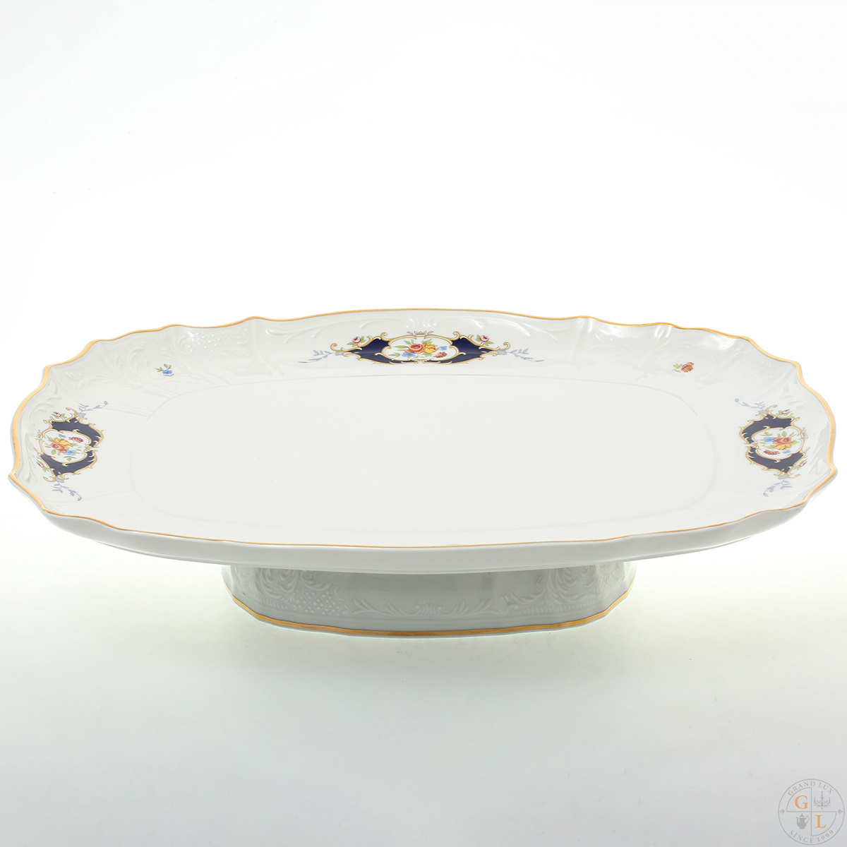 Поднос на ножке bernadotte синий глаз 40 см. Поднос 40 см на ножке Бернадотт Синий глаз Такой поднос очень удобен для подачи бутербродов и других закусок к столу – каждому гостю будет легко дотянуться к лакомству. Поднос из чешского фарфора очень устойчивый, ас воим декором гармонично дополнит другие предметы сервировки из коллекции Синий глаз. Тип товара Подносы (Чехия, Фарфор, Bernadotte) Страна происхождения Чехия Материал Фарфор Бренд Bernadotte Серия Синий глаз Назначение Предмет домашнего обихода из фарфора Длина/Ширина/Высота, см 40/40/5