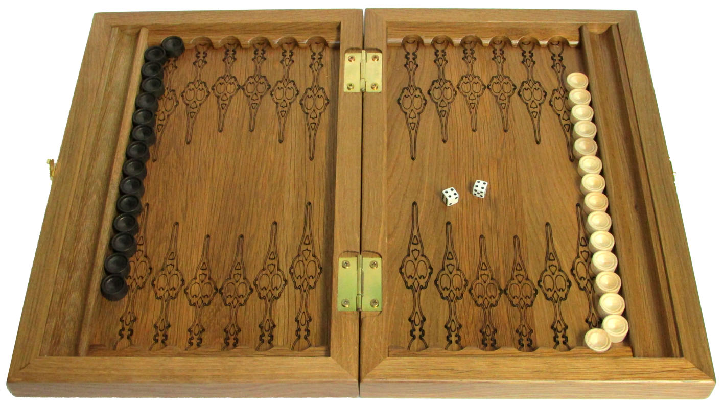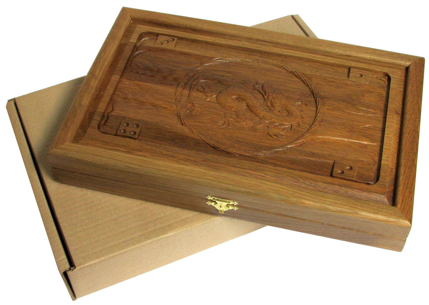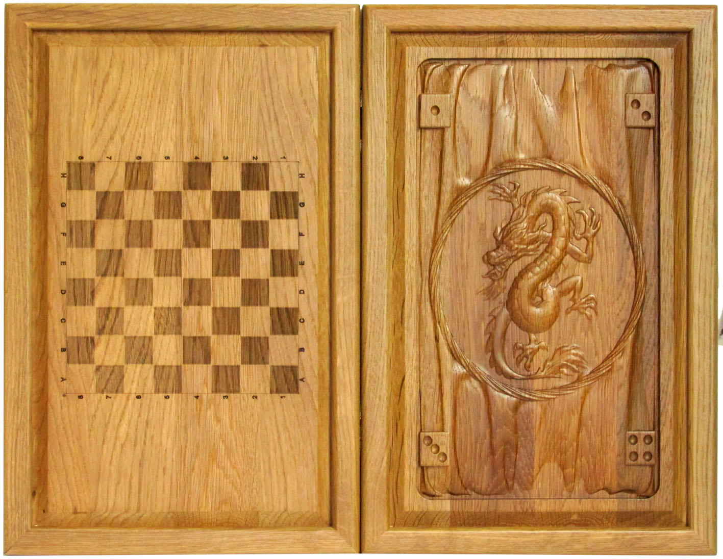 Резные объемные нарды+шашки дорожного размера из массива мореного дуба &qu. Артикул: 33-14 Наименование: Резные объемные нарды+шашки дорожного размера из массива мореного дуба Дракон Размер: 36 х 46 см Описание: Материал: Мореный дуб Технология: Резьба по массивуОдна из лучших досок дорожного размера. Размер не самый маленький (встречаются нарды и меньших размеров), однако нашей целью было создать нарды минимального из УДОБНЫХ размеров. Эта доска соответствует всем основным запросам любителей игры в нарды: - Деревянные фишки из массива березы с углублением по центру легко перемещаются пальцами. Диаметр фишки 19 мм - Возможность выставить все фишки вдоль края поля, что важно при игре в длинные нарды - Удобные ячейки из массива мореного дуба - Ложемент для хранения фишек и костей по краю поля С внешней стороны на лицевой филенке вырезан объемный дракон в стиле мортал комбат. На оборотной филенке вырезана доска для игры в шашки. Упаковка: транспортная картонная коробка. ВАЖНО: Нарды будут иметь такой же резной рисунок, у них будет такая же фурнитура и точно так же будут выделены стрелки на поле, НО рисунок дерева неповторим. Поэтому Вы не сможете получить точно такие же нарды, как на сайте. Для того, чтобы игра в нарды доставила Вам еще большее удовольствие, предлагаем заменить фишки штатной комплектации на изысканные фишки из экзотического самшита и золотистого розового дерева, диаметром 19 мм, которые помогут дополнить эту игру еще и замечательным звучанием драгоценных пород деревьев.