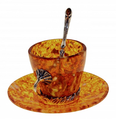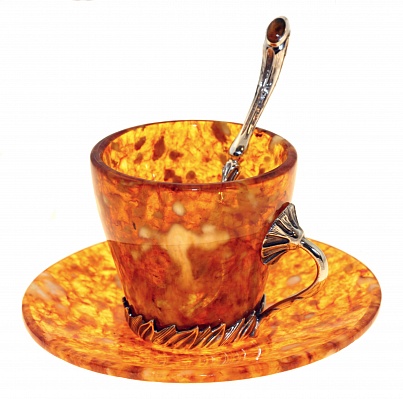 Чашечка для кофе "лето". Высота чашки: 5,5 см, диаметр чашки: 6,0 см, диаметр блюдца: 11,0 см Объем: 75 мл Состав: натуральный янтарь, белая ювелирная бронза или серебро 875 пробы. В набор входит чашка, блюдце, ложечка. Набор в элегантном футляре. Может поставляться наборами на 1, на 2, на 3 и на 6 персон. Мы рекомендуем пить из этой чашки кофе температурой не более 80 гр. В случае отсутствия товара на складе срок изготовления от трех недель.