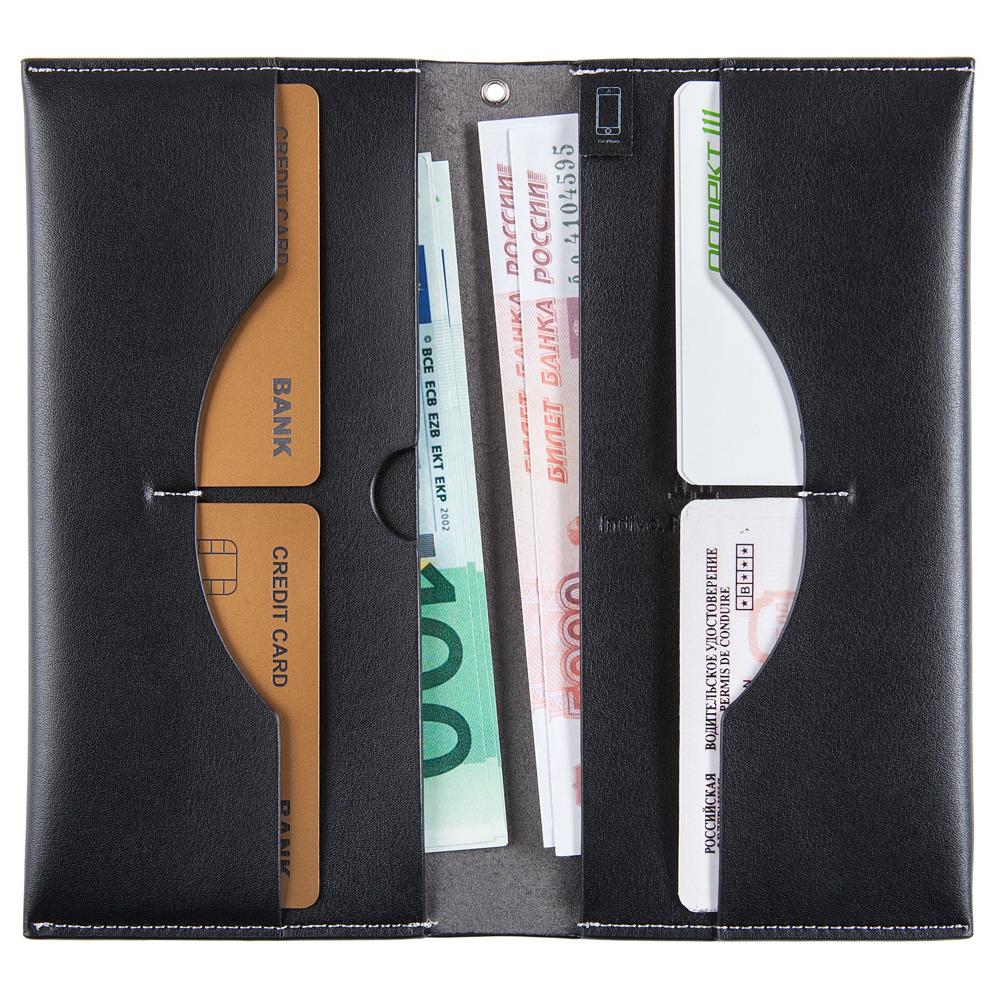 Органайзер имеет отделения для купюр, паспорта и телефона, четыре кармана для пластиковых карт. Закрывается на магнит, дополнен удобным съемным ремешком.