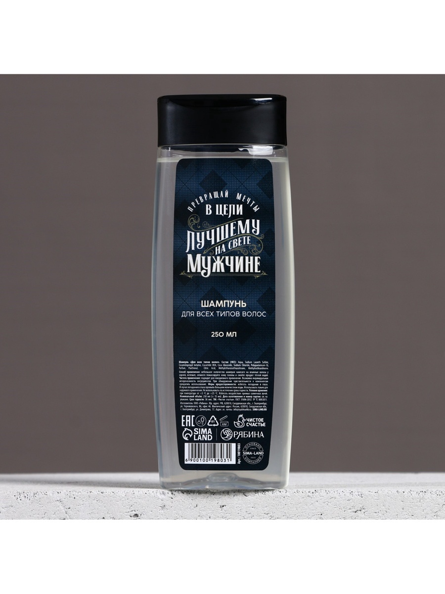 Шампунь для волос «лучшему мужчине», 250 мл, аромат мужского парфюма, чистое счастье. Состав: Aqua, Sodium Laureth Sulfate, Cocamidopropyl betaine, Cocamide DEA, Coco Glucoside, Sodium Chloride, Polyquatemium-10, Parfum, Panthenol, Citric Acid, Methylchloroisothiazolinone, Methylisothiazolinone Набор:Нет|Цвет:Прозрачный|Для кого:Для мужчины|В упаковке, шт.:1|Объём, мл:200|Вид упаковки:Без упаковки|Тематика праздника:Универсальная тематика|Адресат:Мужчине|Аромат:Парфюм|Темпер. ограничение НЕ НИЖЕ :+5|Темпер. ограничение НЕ ВЫШЕ :+25|Возраст:Для взрослых|Тип волос:Для всех типов|Эффект:Очищение|Вид шампуня:Жидкий|Назначение:Очищение, детокс|Форма выпуска:Флакон без дозатора|Страна:Россия  развернуть описание ▼
