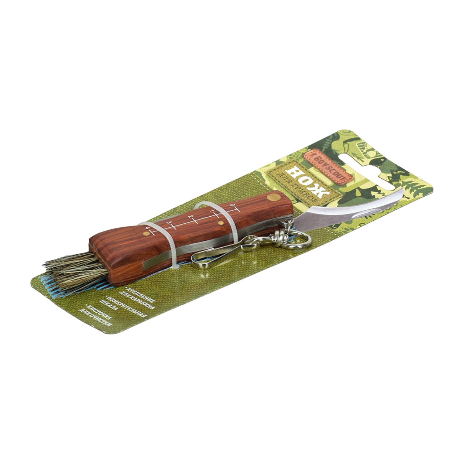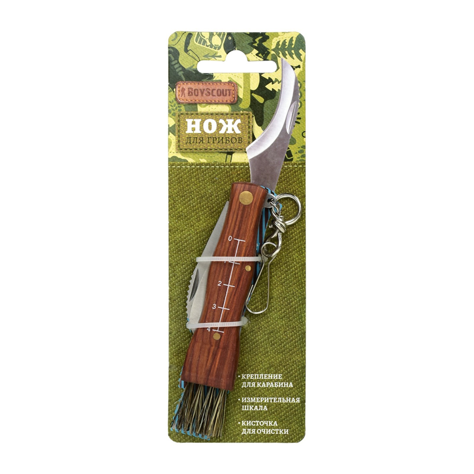 Нож грибника boyscout, с щеткой. Нож грибника имеет карабин для крепления, измерительную шкалу и косточку для очистки грибов. Лезвие изготовлено из нержавеющей стали. Размер: 21 х 2, 5 х 1, 5 см в разложенном состоянии, 13, 5 х 3 х 1, 5 см в сложенном состоянии. Твёрдость лезвия, HRC: 59 Длина лезвия, см: 75 Материал ручки: Дерево Фиксатор: Нет Тип ножа: Складной неавтоматический  развернуть описание ▼