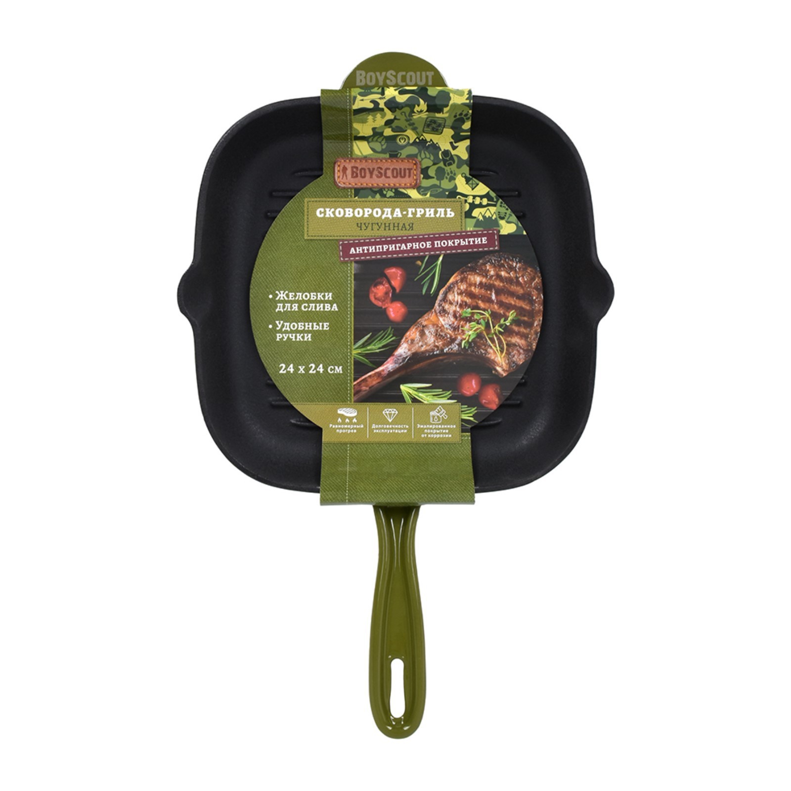 Сковорода чугунная эмалированная Boyscout, гриль для стейков 24х24 см