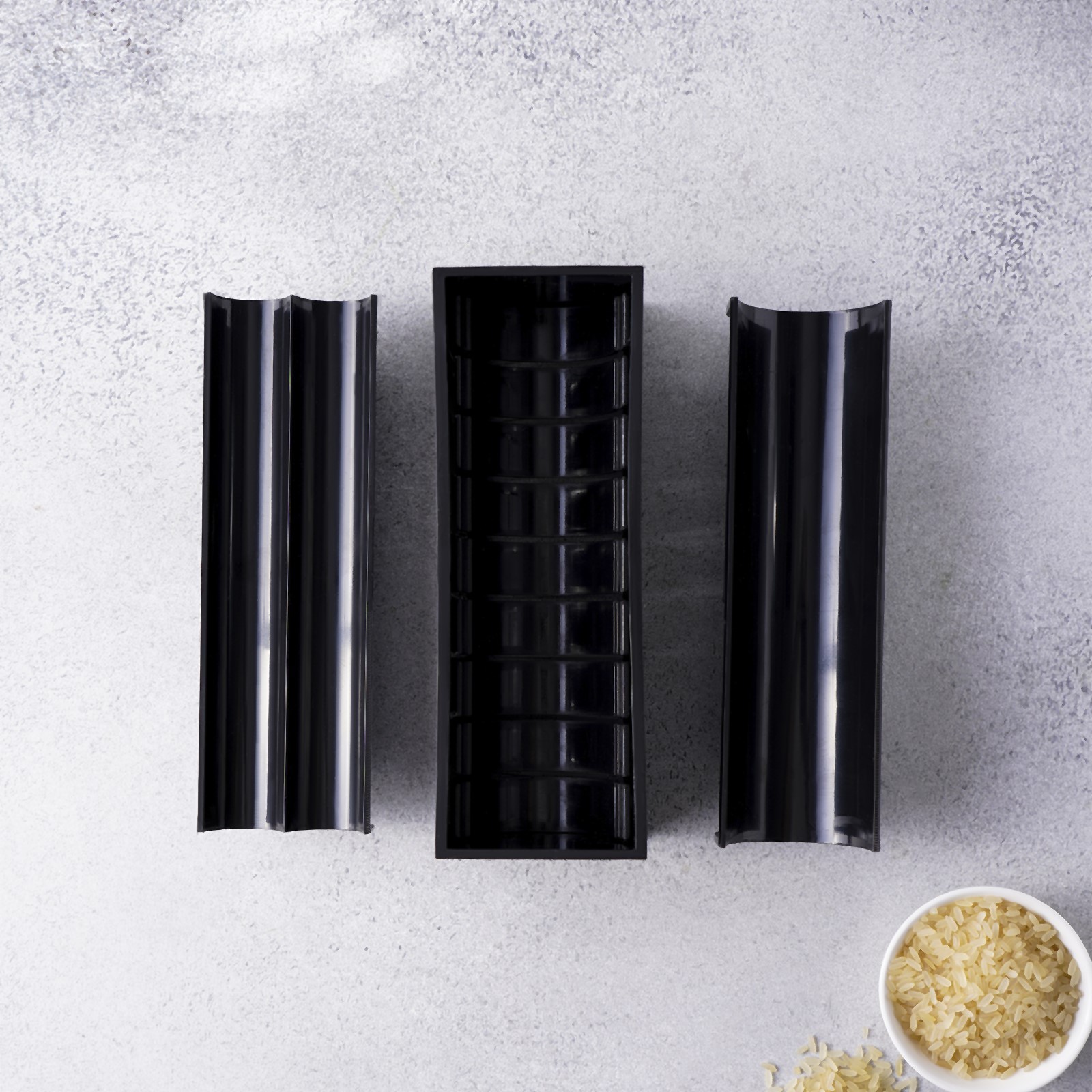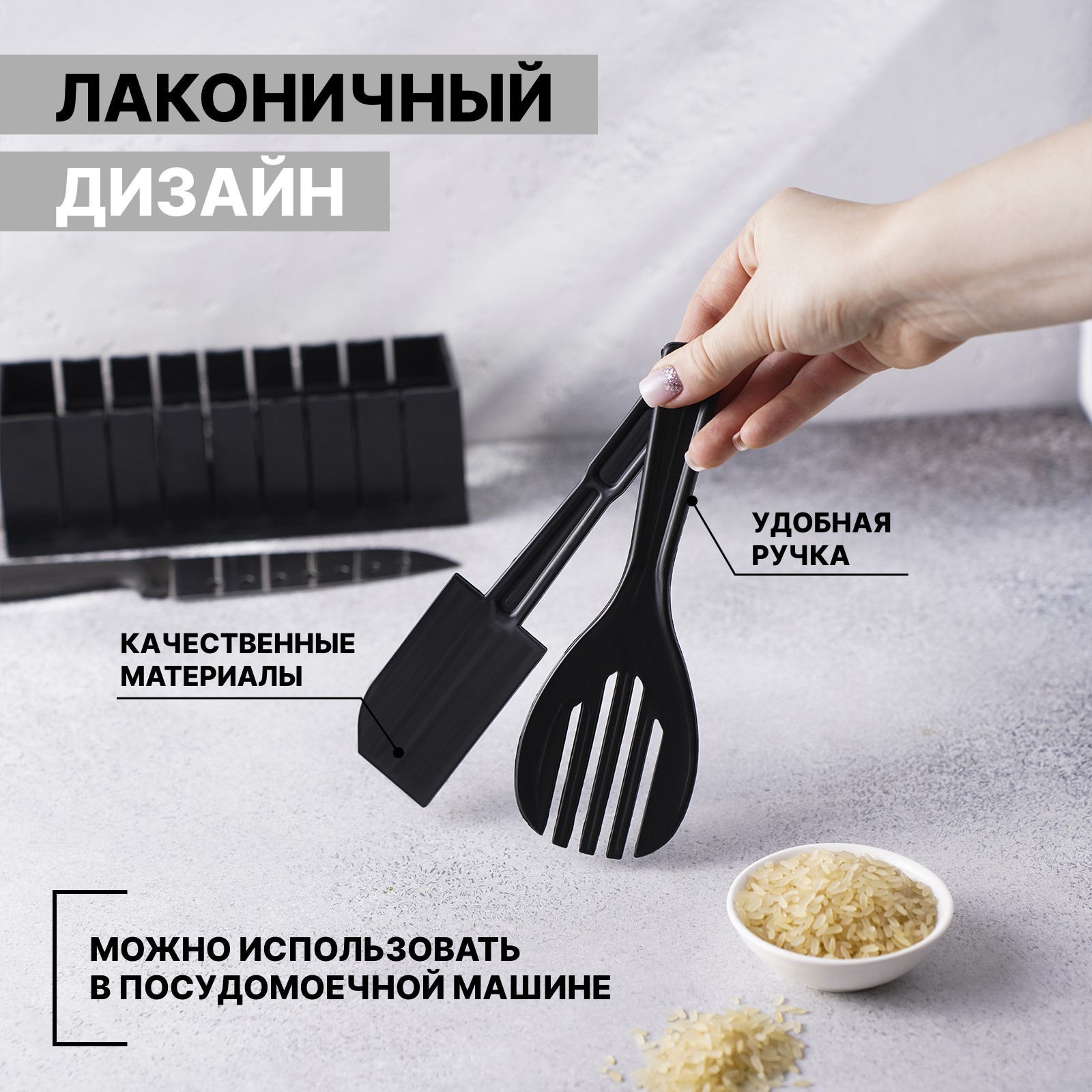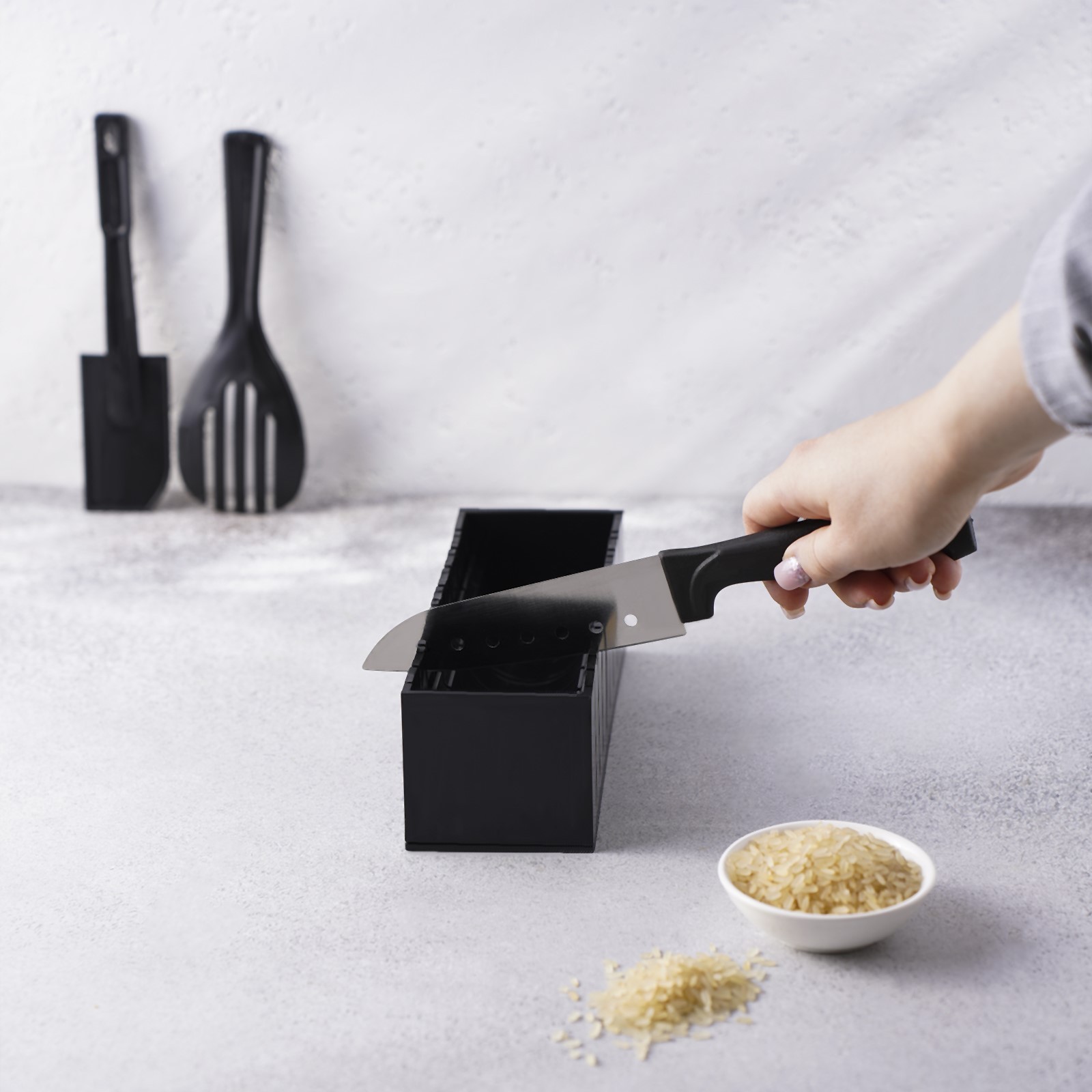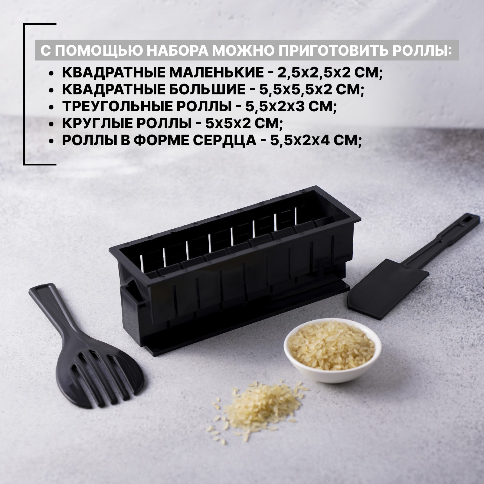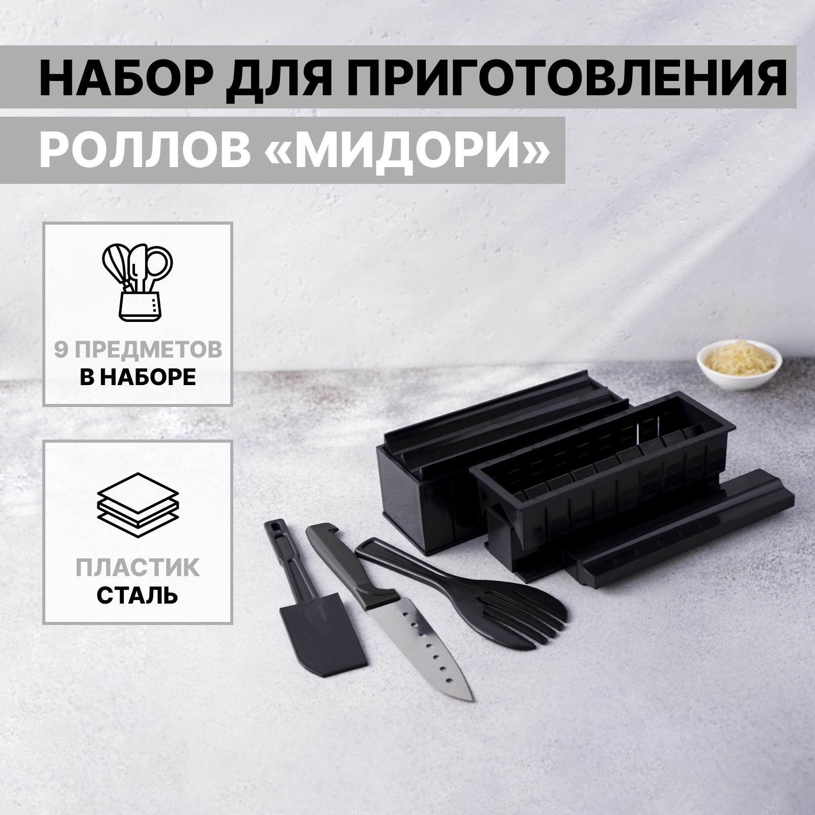 Набор для приготовления роллов доляна «мидори», 9 предметов, нож 15 см. Готовить идеально плотные и аккуратные роллы различных размеров и форм — это реально? Конечно! С нашим набором «Мидори» даже новичок способен быстро и без усилий создать настоящий кулинарный шедевр. Что входит в комплект? прямоугольная форма-держатель — 1 шт. ;основание для приготовления роллов в форме сердца, 20х7, 5х4 см — 1 шт. ;крышка-пресс для приготовления роллов в форме сердца, 20х7, 5 см — 1 шт. ;основание для приготовления овальных роллов, 20х7, 5х4 см — 1 шт. ;крышка-пресс для приготовления овальных роллов, 20х7, 5 см — 1 шт. ;крышка-пресс для приготовления треугольных роллов, 20х7, 5 см — 1 шт. ;основание для приготовления квадратных роллов, 20х3, 5х4 см — 1 шт. ;пресс, 20х3 см — 1 шт. ;лопатка для разравнивания риса, 19х4, 5х0, 5 см — 1 шт. ;вилка для риса круглая, 18, 5х6, 5х0, 5 см — 1 шт. ;нож «Профессионал», 27, 5 см (длина лезвия — 15, 5 см) — 1 шт. Что получаем? С помощью набора можно приготовить роллы: квадратные маленькие, 2, 5х2, 5х2 см;квадратные большие, 5, 5х5, 5х2 см;треугольные роллы, 5, 5х2х3 см;круглые роллы, 5х5х2 см;роллы в форме сердца, 5, 5х2х4 см. При правильном использовании предметов из набора все роллы получатся плотными, не будут разваливаться в процессе приготовления. Немного потренировавшись, вы сможете быстро и легко готовить роллы на большую компанию за считанные минуты. Как готовить? Перед началом приготовления убедитесь, что формы абсолютно сухие. При необходимости протрите их салфеткой или кухонным полотенцем. Берём форму-держатель и помещаем в неё фигурное основание. Кладём лист нори в выбранное основание. Внимательно следим, чтобы концы листа немного выступали за края формы. С помощью специальной вилочки аккуратно раскладываем небольшое количество риса и, используя маленький пресс, делаем в рисе небольшое углубление. Размещаем в углублении начинку (можно использовать рыбу, мягкие сыры, овощи или мясо). Специальной вилочкой раскладываем рис поверх начинки. Действуя лопаткой из набора, ровняем рис и загибаем края нори. Берём фигурную крышку-пресс и аккуратно надавливаем на наш ролл. С помощью особого ножа делим получившийся рулет на отдельные роллы (режем вдоль формы, по специальным прорезям). Готовое блюдо можно украсить по вашему вкусу. Экспериментируйте с начинками и формами и удивляйте друзей и родных. Набор можно мыть вручную или загружать в посудомоечную машинку. Он станет замечательным подарком к любому празднику. Цвет: Чёрный В наборе, шт.: 10 Материал: Пластик Вид: Набор посуды  развернуть описание ▼