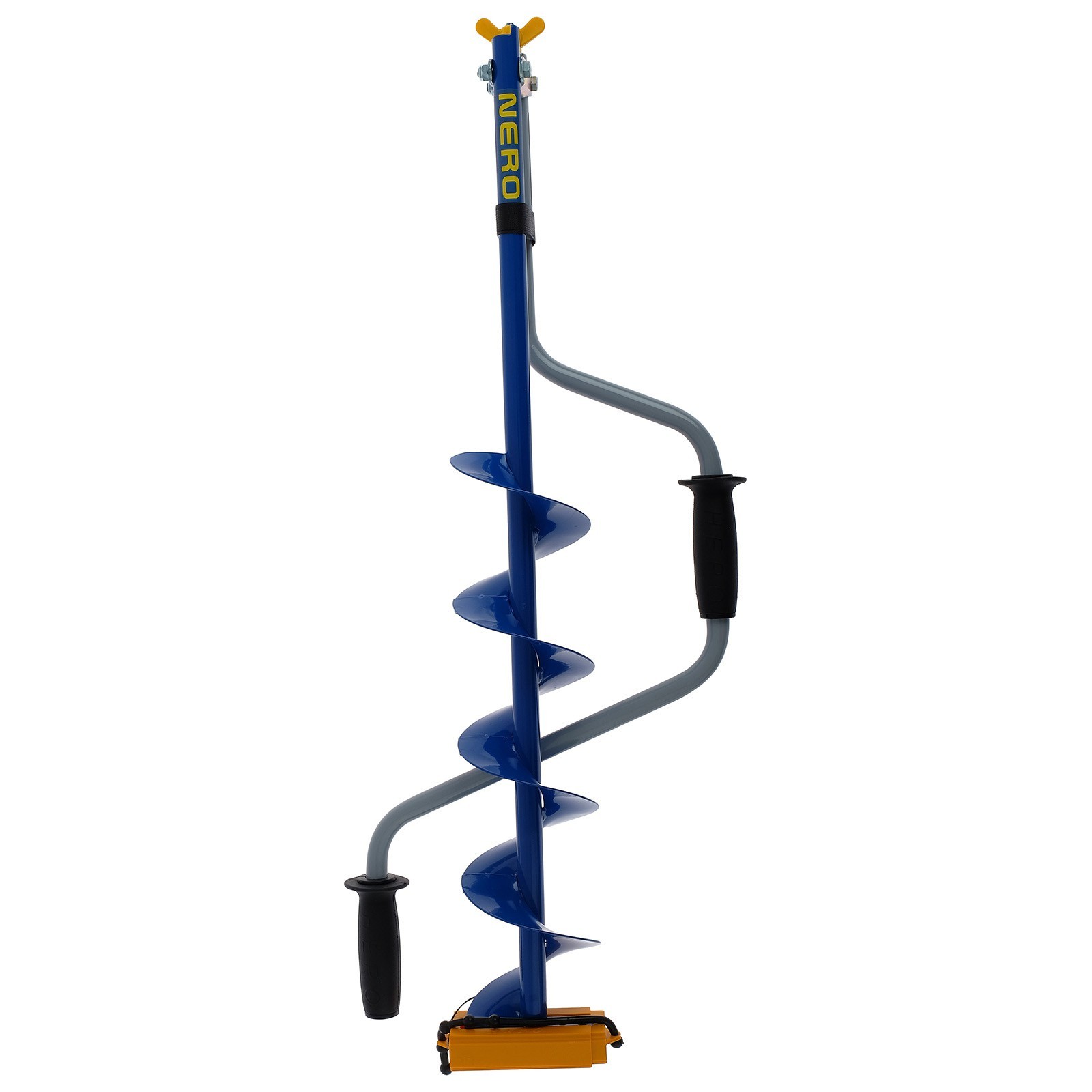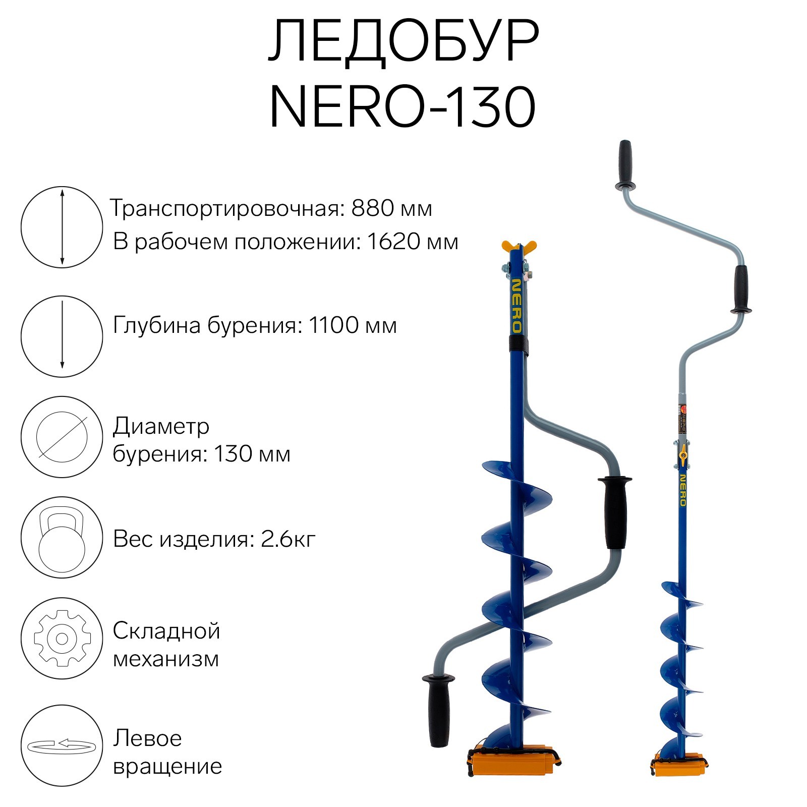 Ледобур nero-130, l-шнека 0.5 м, l-транспортировочная 0.88 м, l-рабочая 1.1 м, 2.6 кг. Сочетание привычной классической конструкции с надежностью и эффективной работой делают эту линейку чрезвычайно востребованной среди большинства рыболовов, занимающихся подледным ловом. Рабочее вращение — левое (против часовой стрелки)Увеличенное расстояние между витками шнека«Планетарная» рукоятьМатериал ручек - «тёплый» морозостойкий пластикСоединение секций ледобура сделано «в замок», что позволило практически полностью снять нагрузки с петлиСекции ледобура соединены мощной петлей, которую в развернутом положении фиксируют жестко установленная шпилька и гайка-барашек, совмещенная с пресс-шайбой и опластикованная прочным полиамидом. Все металлические детали узла оцинкованы. Фиксаторы ручек (полиамид), обладают высокой прочностью, обеспечивают надежное крепление, а так же легкость скольжения при вращении ледобура. Тщательно рассчитанная геометрия рабочей части шнека гарантирует эффективную работу бура в любых ледовых условиях. Межцентровое расстояние отверстий для крепления ножей составляет 16 мм. Расстояние между соседними витками шнека — 120 мм. В комплекте к ледобуру идут полукруглые ножи. Ледобуры после демонтажа рукояти без проблем можно соединить с удлинителями, позволяющими увеличить глубину бурения или с адаптером Неро под шуруповерт Диаметр, мм: 130 Глубина бурения, м: 1.1 Вес, кг: 2.3 Транспортная длина, см: 88 Тип: Ледобур Вид ледобура: Двуручный Направление вращения: Левое (против часовой стрелки) Товар Каспи: Ледобуры для рыбалки  развернуть описание ▼
