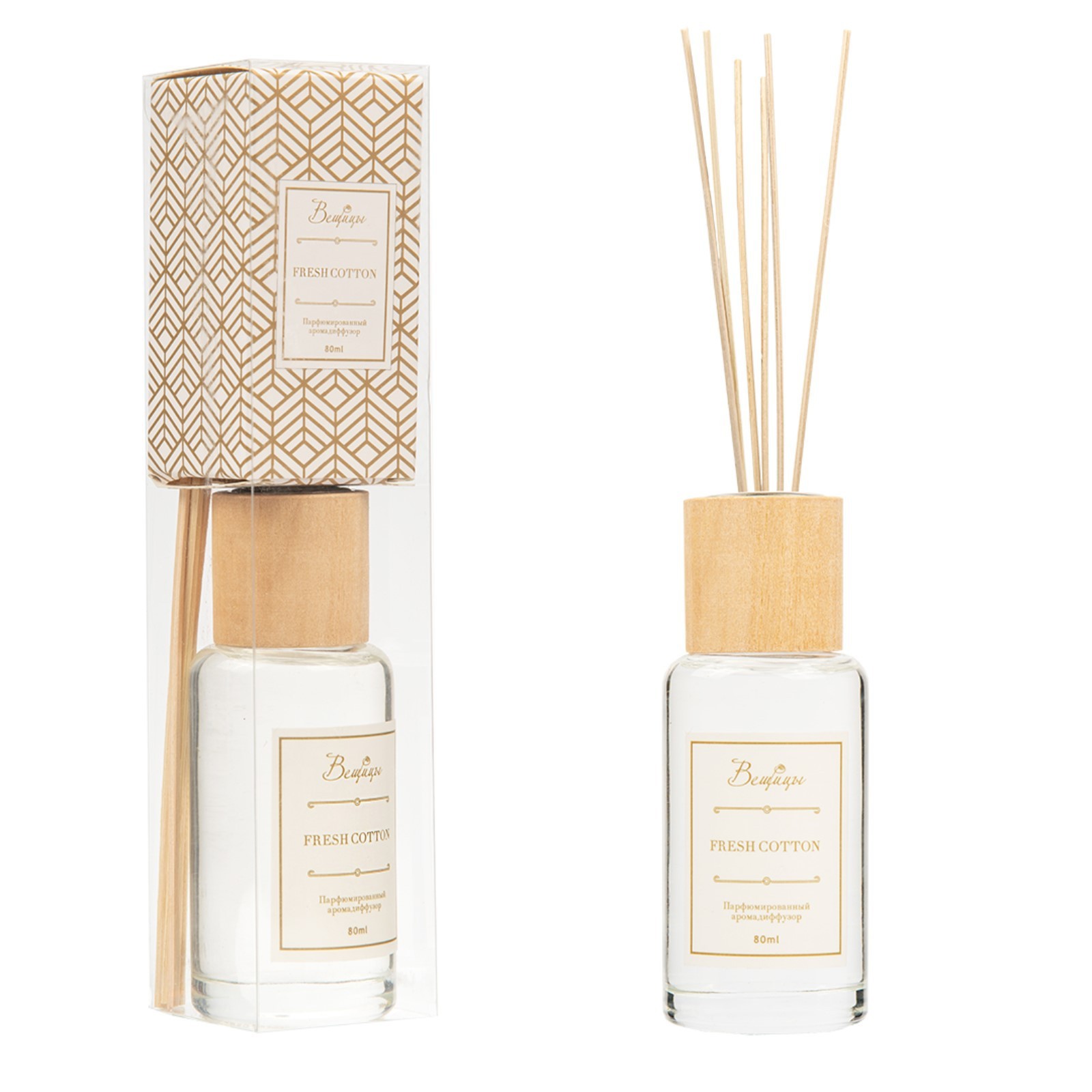 Парфюмированный аромадиффузор «вещицы» fresh cotton, 80 мл. Богатый цветочный аромат, сочетающий в себе свежие цитрусовые ноты бергамота и мандарина, нежного жасмина и фиалки, аккорды чувственного иланг-иланга и древесное звучание кедра. Богатый цветочный аромат, сочетающий в себе свежие цитрусовые ноты бергамота и мандарина, нежного жасмина и фиалки, аккорды чувственного иланг-иланга и древесное звучание кедра. Верхние ноты: миндаль, бергамот, мандарин. Средние ноты: фиалка, роза, цветок апельсина, жасмин, иланг-иланг. Базовые ноты: сандал, мускус, ваниль, кедр. Объём, мл: 80 Вид ароматизатора: Диффузор Аромат: Кедр Аромат: Ваниль Аромат: Жасмин Аромат: Бергамот  развернуть описание ▼