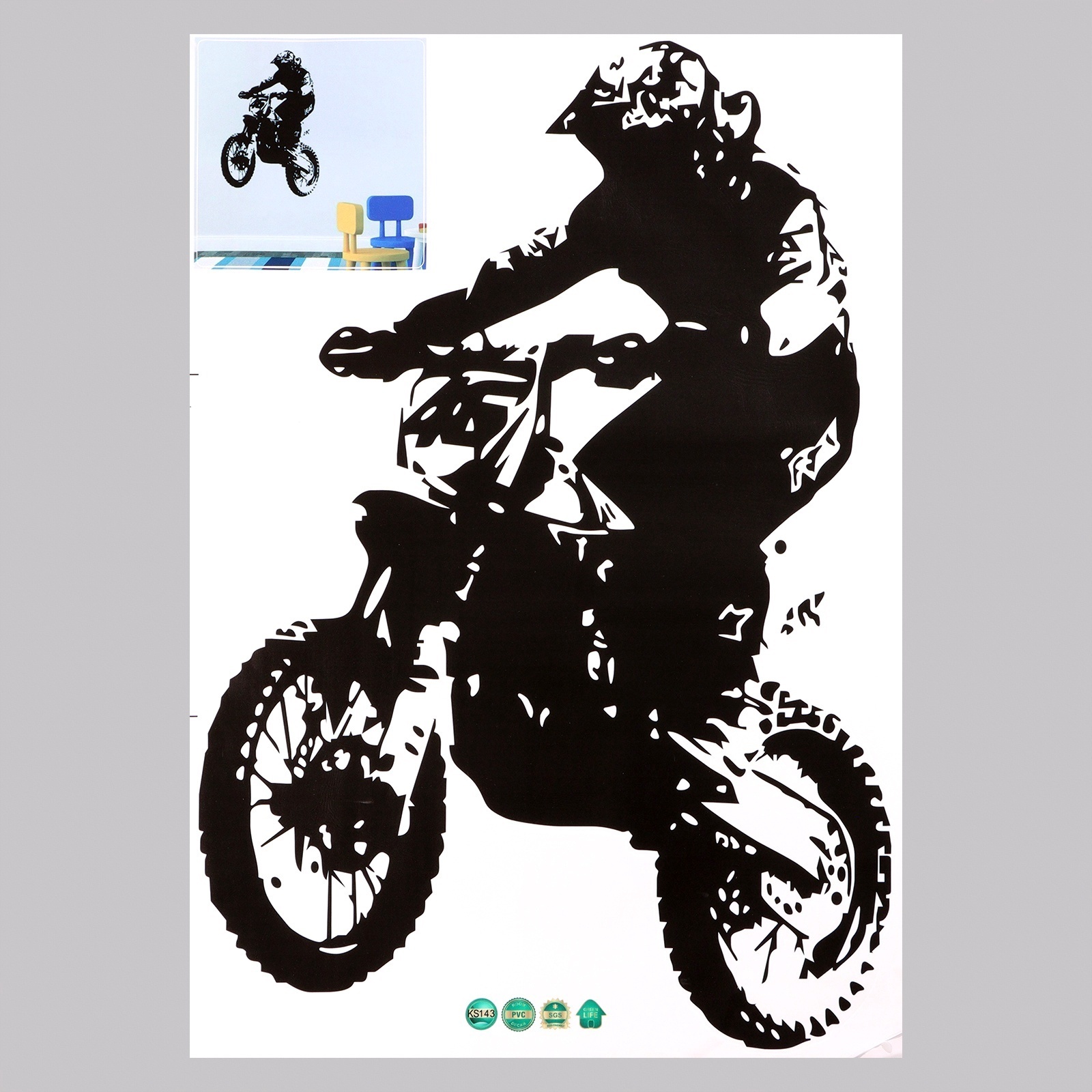 Интерьерная наклейка 3д take it easy «эндуро», 85 57 см. Самоклеющиеся 3D панели станут отличным вариантом в оформлении интерьера дома, делая его веселее. Панели просты в использовании: достаточно просто удалить защитный слой на обратной стороне и ровно прижать её к поверхности. Главное в этом процессе не допустить образования воздушных пузырей. Для этого нужно будет прикатать поверхность пластиковым шпателем, выдавливая воздух изнутри. Правила поклейки: Основание должно быть чистым, ровным и гладким. Перед работой нужно вымыть и обезжирить предполагаемое место нанесения.Нельзя производить поклейку на стыках плитки, и других неровностях. В этих местах панели быстро придут в негодность.Оптимальным основанием для поклейки являются лакированные и глянцевые поверхности, ламинат, крупная плитка или керамогранит. Линолеум лучше не использовать в качестве основания, так как он имеет мягкую поверхность из-за подложки и будет прогибаться при нагрузке.Набор:Нет|Цвет:Чёрный|Тематика:3D-эффект|Тематика:Транспорт|Тематика праздника:23 Февраля|Материал:ПВХ|Вид спорта:Мотоспорт|Вид наклейки:Интерьерная|Страна:Китай  развернуть описание ▼