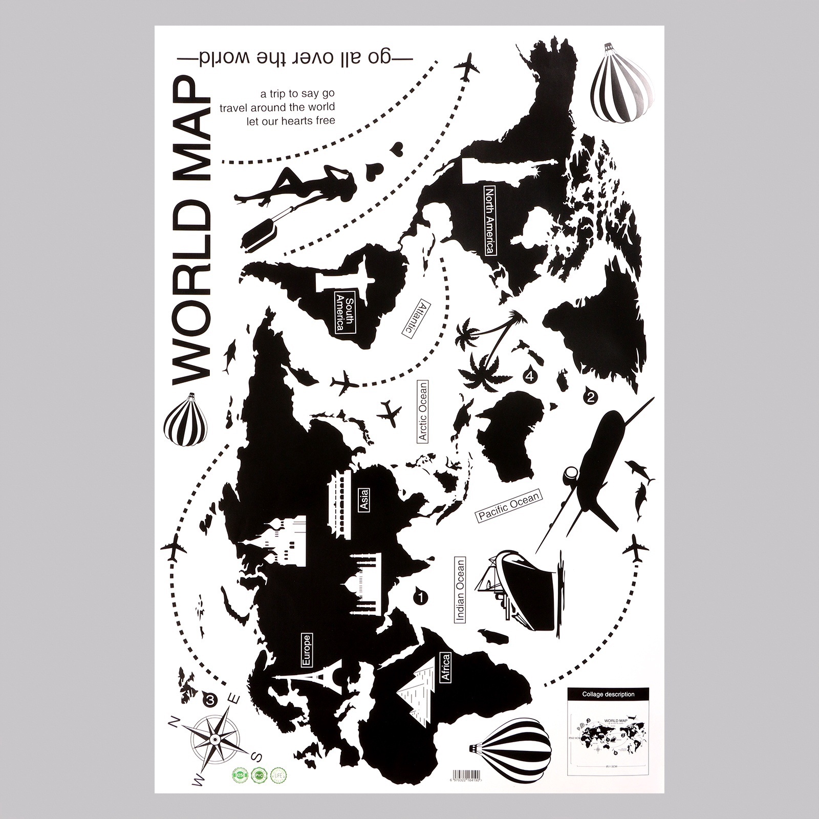 Интерьерная наклейка 3д take it easy «карта мира», 90 60 см. Самоклеющиеся 3D панели станут отличным вариантом в оформлении интерьера дома, делая его веселее. Панели просты в использовании: достаточно просто удалить защитный слой на обратной стороне и ровно прижать её к поверхности. Главное в этом процессе не допустить образования воздушных пузырей. Для этого нужно будет прикатать поверхность пластиковым шпателем, выдавливая воздух изнутри. Правила поклейки: Основание должно быть чистым, ровным и гладким. Перед работой нужно вымыть и обезжирить предполагаемое место нанесения.Нельзя производить поклейку на стыках плитки, и других неровностях. В этих местах панели быстро придут в негодность.Оптимальным основанием для поклейки являются лакированные и глянцевые поверхности, ламинат, крупная плитка или керамогранит. Линолеум лучше не использовать в качестве основания, так как он имеет мягкую поверхность из-за подложки и будет прогибаться при нагрузке.Тематика:Карта мира|Тематика:Достопримечательности|Тематика:Города и архитектура|Тематика:3D-эффект|Тематика праздника:Универсальная тематика|Материал:ПВХ|Вид наклейки:Интерьерная|Страна:Китай  развернуть описание ▼