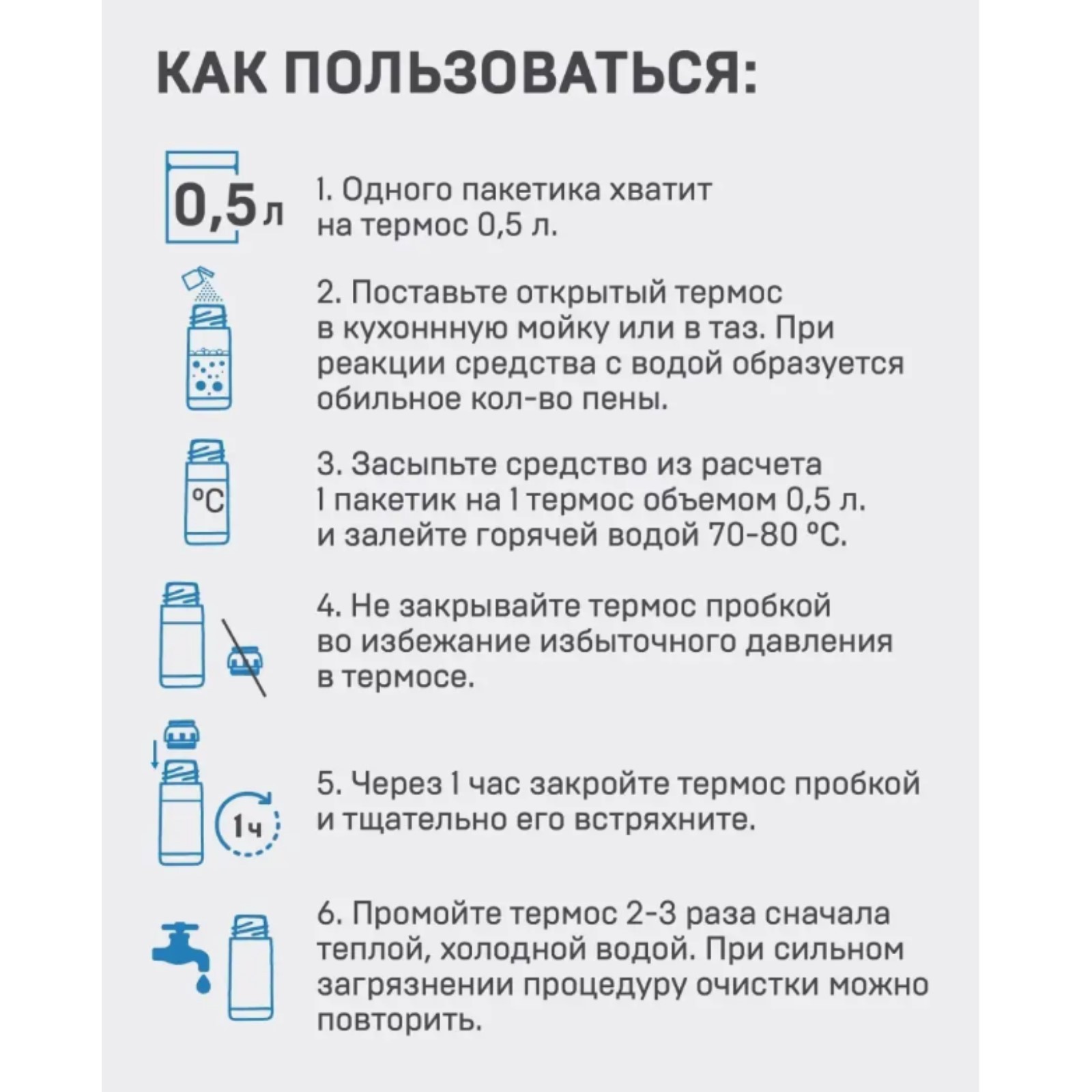 Чистящее средство для стали, для термосов и термокружек "чистотерм", 5 пакетиков. Специализированное чистящее средство для термосов и термокружек помогает удалить налет от чая или кофе и засохшие остатки пищи, полностью устраняя въевшиеся неприятные запахи и застарелые пятна. Подходит как для термосов со стальной колбой, так и со стеклянной. Легко очищает налет даже в труднодоступных местах, и при этом не нужно использовать губку или щетку: после растворения порошка в горячей воде он превращается в пену, активно взаимодействуя с налетом на стенках внутри термоса. Для удобства использования один пакетик рассчитан на объем 500 мл. Вес, г: 50 Температурное ограничение: Нет Вид: Очищающее средство  развернуть описание ▼