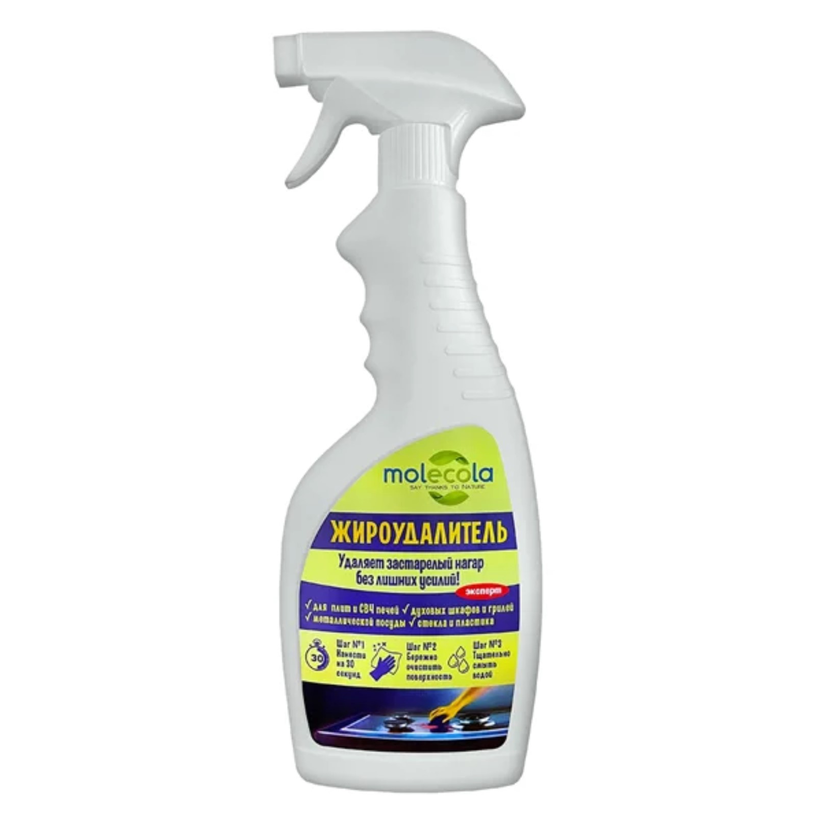Средство для уборки, жироудалитель molecola, 500 мл. Незаменимое в быту сверхмощное средство для удаления свежих и застарелых жировых загрязнений, следов нагара и копоти с поверхностей: плит, грилей, духовых шкафов, СВЧ-печей, металлической посуды, стеклянных и пластиковых поверхностей. При правильном применении не наносит вреда покрытию, мягко очищает, не оставляя царапин, повреждений и разводов. Устраняет ощущение липкости. Легко смывается тёплой водой. Способ применения Наденьте защитные перчатки, откройте поворотный механизм носика спрей, распылите небольшое количество раствора с расстояния 25-20 см на загрязненную поверхность и оставьте на 30 секунд. После этого тщательно уберите остатки средства вместе с загрязнениями неабразивной губкой, чтобы не повредить поверхность. При очищении не используйте острые предметы (ножи, пилки и др. ). Состав Вода очищенная, гидроксид калия, алкилполиглюкозиды, комплекс активаторов, краситель. Объём, мл: 500 : 0  развернуть описание ▼