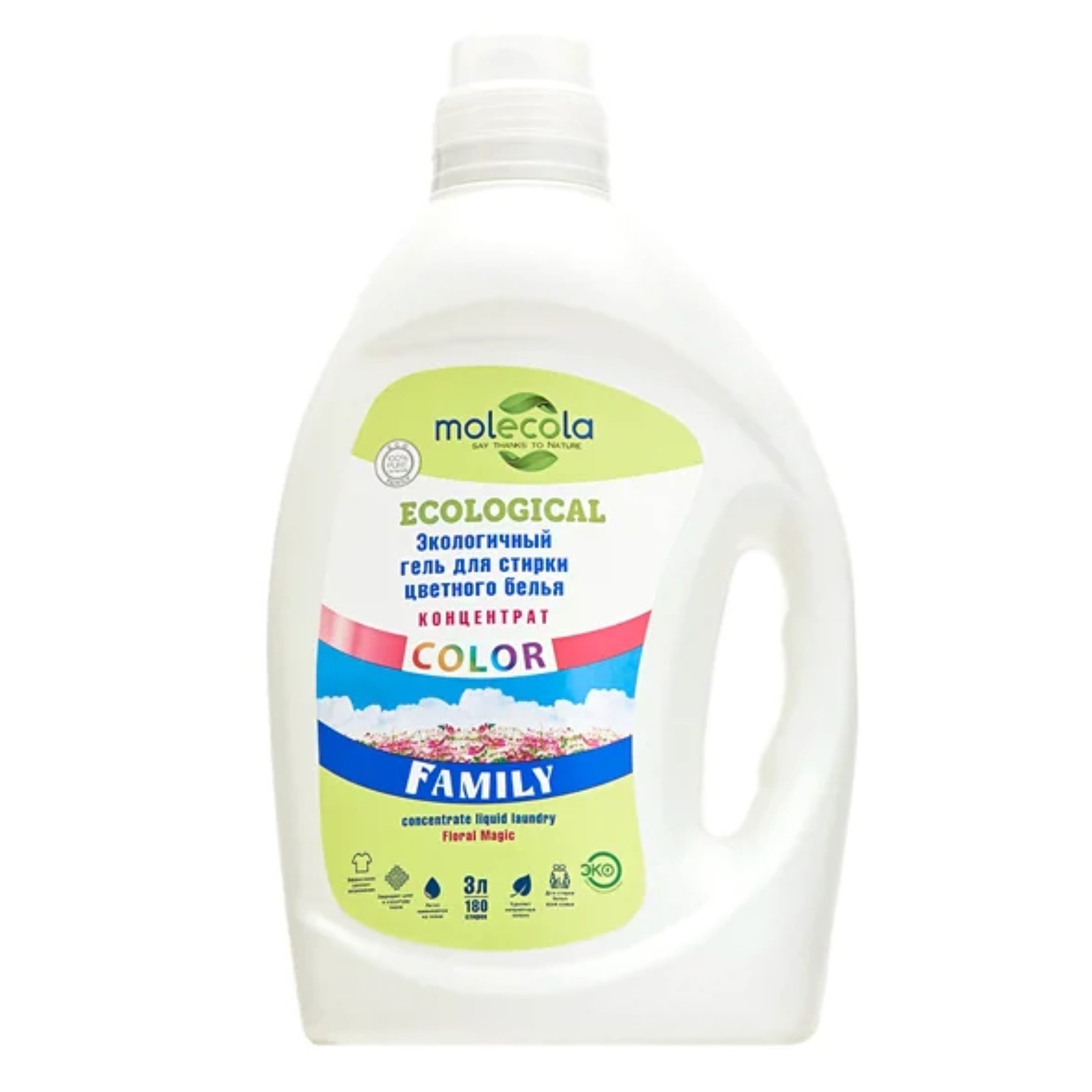Экологичный гель для стирки molecola family color, 3 л. Экологичный гель подходит для стирки цветной нелиняющей одежды и постельного белья всей семьи. Эффективно удаляет загрязнения, не повреждая волокна ткани. Подходит для стирки любых цветных тканей, кроме шёлка и шерсти. Высокая концентрация активных растительных ПАВ обеспечивает эффективную стирку и экономию средства. Не содержит фосфатов, оптических отбеливателей и искусственных красителей. Формула на основе безопасных растительных ингредиентов обеспечивает высокую эффективность и экологичность использования. Подходит для всех типов стиральных машин и ручной стирки. Способ применения Перед применением стряхнуть. Крышка флакона является дозированным колпачком. 1 колпачок = 30 мл. Следуйте рекомендациям по уходу, указанным на ярлычках одежды. Залейте необходимое количество геля в дозированный отсек или непосредственно в барабан машины. Состав Вода, неионогенные ПАВ 5-15%, анионные ПАВ 5-15%, хлорид натрия 4%, энзимы, консервант, функциональные добавки, парфюмерная композиция. Объём, л: 3 Назначение: Для цветных тканей Вид стирки: Для всех видов стирки : 0 Особенности средства: Экосредство Особенности средства: Гипоаллергенность Особенности средства: Концентрат  развернуть описание ▼