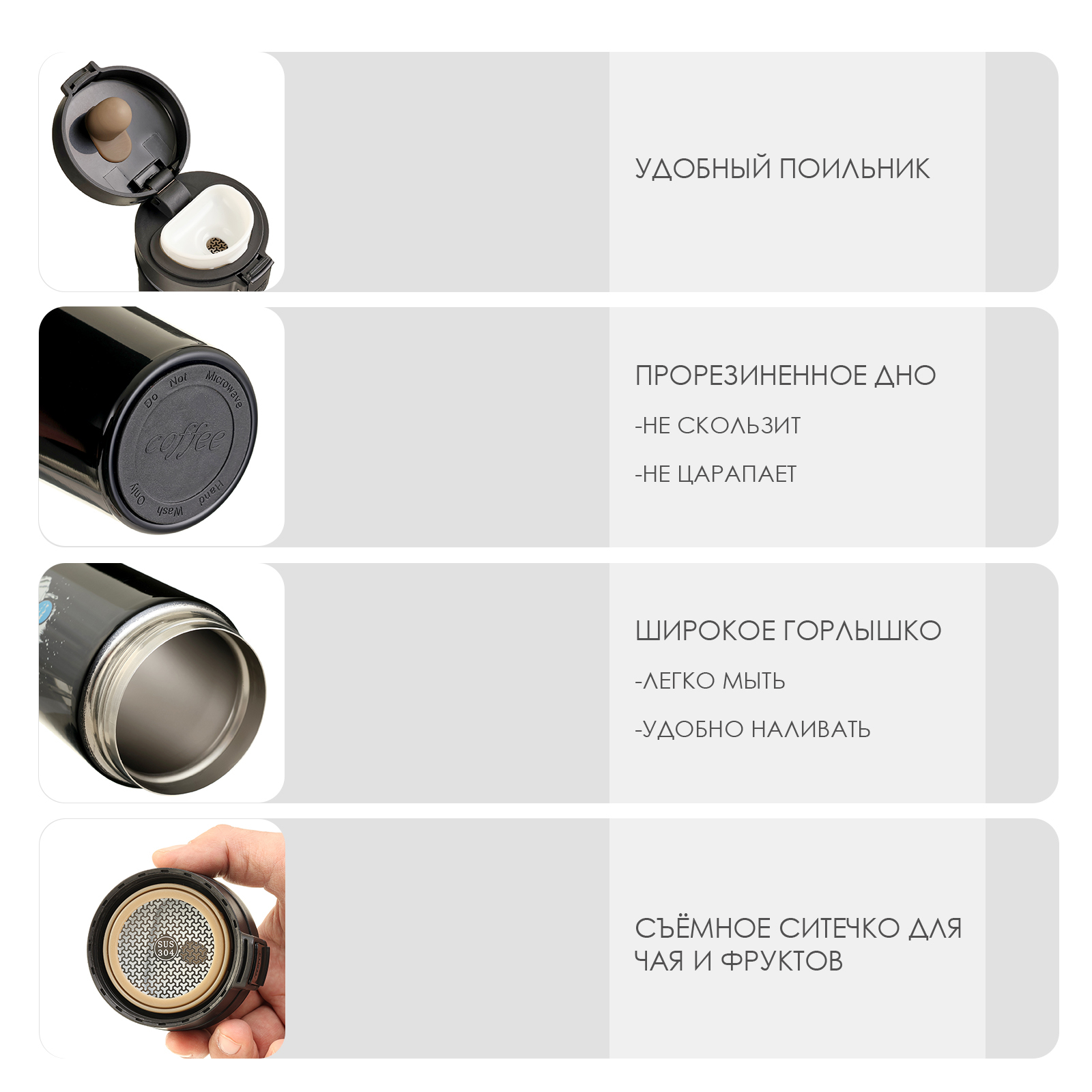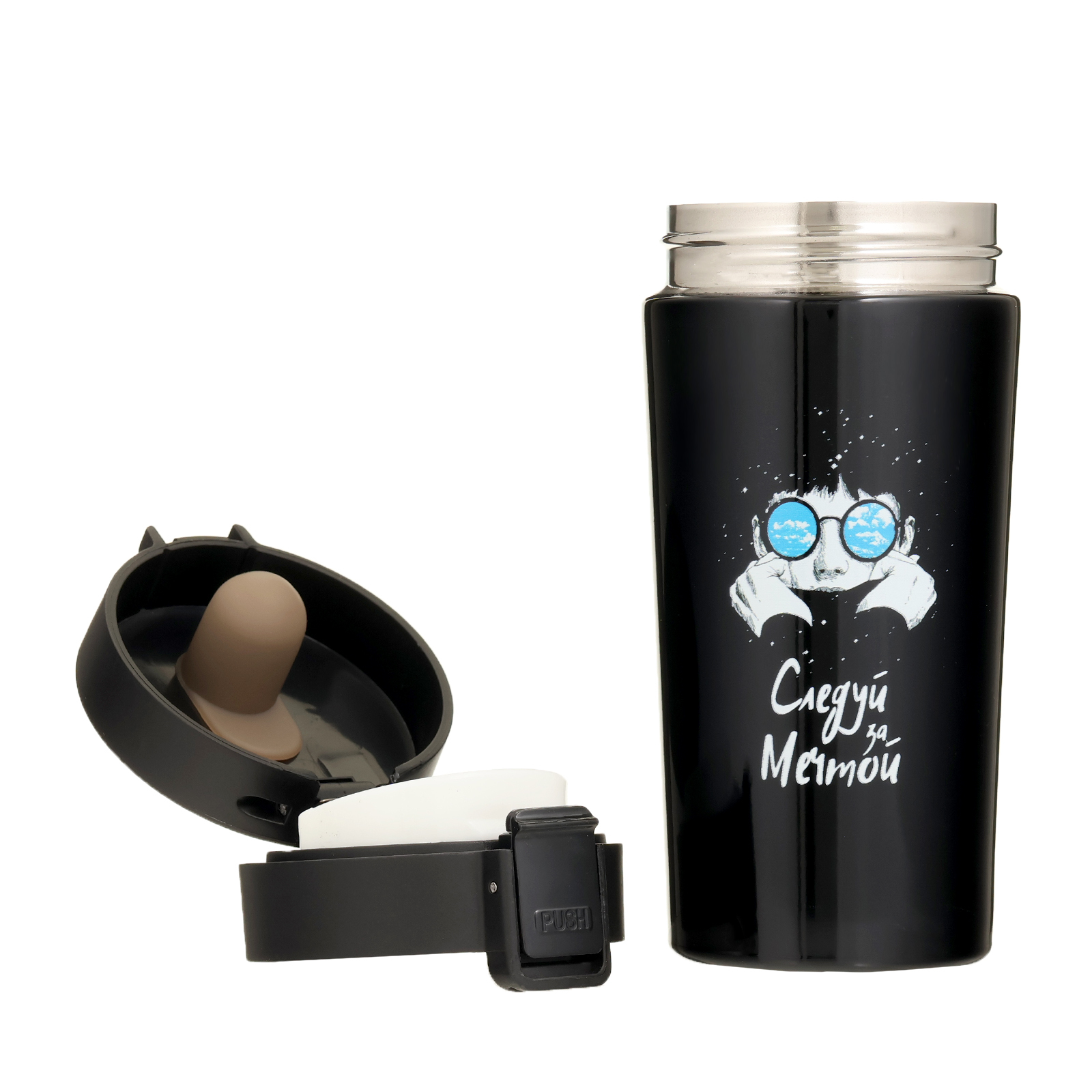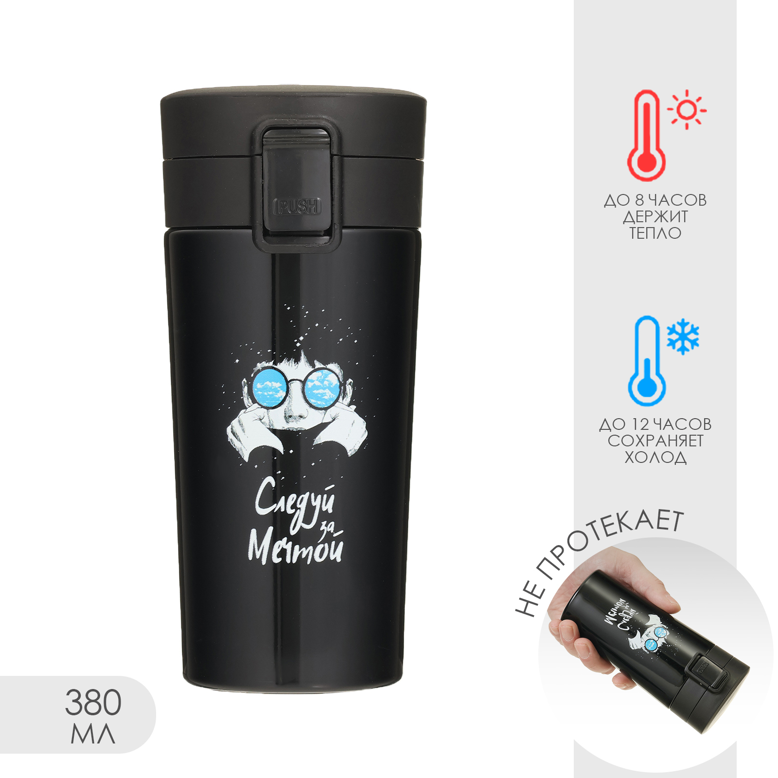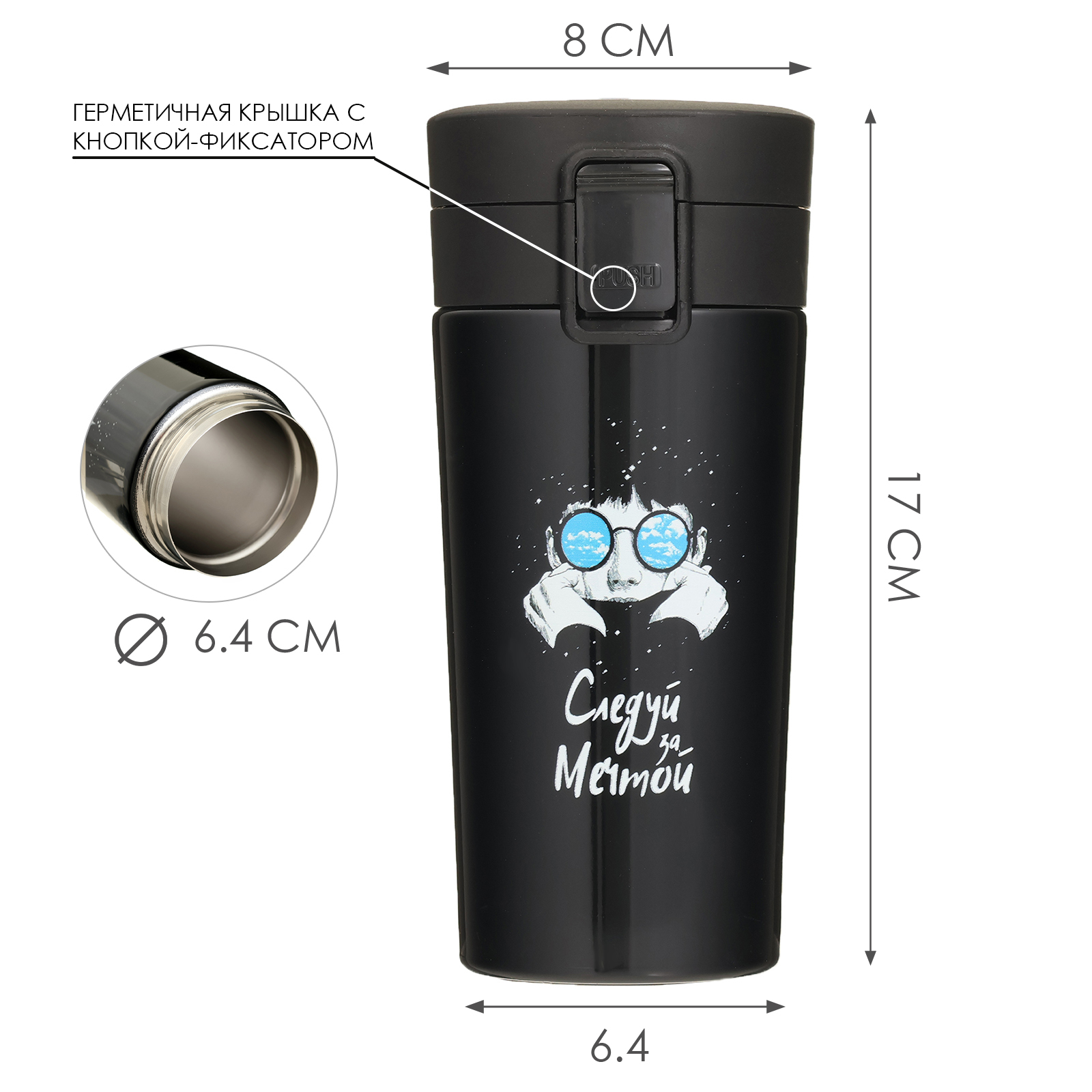 Термокружка, 380 мл, style "следуй за мечтой", сохраняет тепло до 8 ч. Термокружка является незаменимым атрибутом для всех любителей активного отдыха, её удобно брать с собой в поездку на автомобиле и мини путешествия на природу. Благодаря термокружке напитки остывают медленнее, чем в обычной чашке или картонном стаканчике: сохраняет напитки горячими до 8 часов, а холодными - до 12 часов. Классическая модель термо кружки выполнена из нержавеющей стали, которая не взаимодействует с содержимым и не меняет его состава, запаха или вкуса. Элементы термокружки обладают высокой прочностью, герметичная крышка позволит не беспокоиться о протекании напитков. Благодаря компактным размерам и эргономичному дизайну, она легко помещается в сумку или рюкзак, что делает ее идеальным выбором для путешествий, прогулок, походов и активного образа жизни. Термокружка для кофе и чая идеальна для офиса, автомобиля, длительных прогулок и детям в школу, станет идеальным подарком маме, сестре, тёте или подруге на День Рождения, Новый год или любой другой праздник. Цвет: Чёрный Время сохранения тепла/холода, ч: 8 Объём, мл: 380 tnved: 7323930000 Крышка: Нет Материал: Пластик Особенности: С кнопкой  развернуть описание ▼
